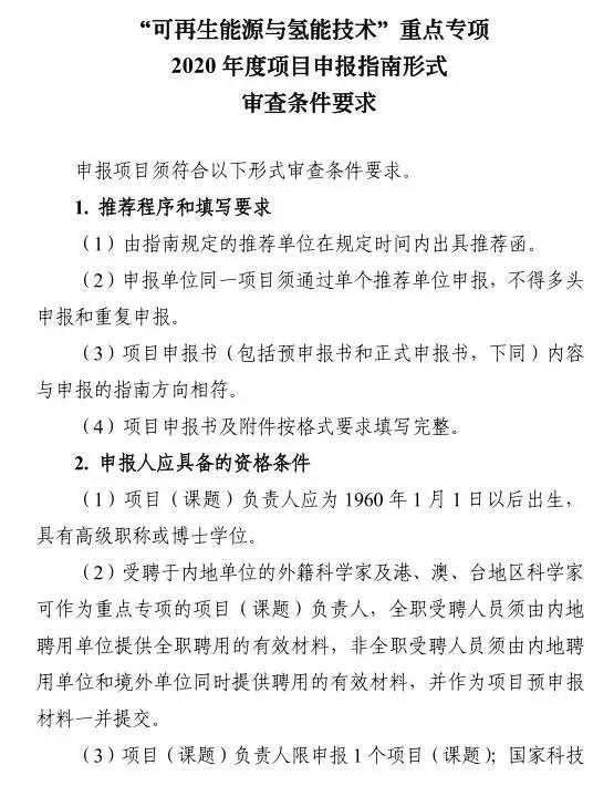 前言 氢云链获悉,科技部近日印发国家重点研发计划“可再生能源与氢能技术”重点专项2020 年度项目申报指南,国拨经费总概算为6.06亿元。其中氢能部分较此前的意见稿增加了碱性离子交换膜制备技术及应用项目。 “可再生能源与氢能技术”重点专项2020 年度项目申报指南 为落实《国家中长期科学和技术发展规划纲要(2006—2020年)》以及《“十三五”国家科技创新规划》《能源技术革命创新行动计划(2016—2030 年)》《能源技术创新“十三五”规划》《可再生能源中长期发展规划》等提出的任务,国家重点研发计划启动实施“可再生能源与氢能技术”重点专项。根据本重点专项实施方案的部署,现发布 2020 年度项目申报指南。 本重点专项总体目标是:大幅提升我国可再生能源自主创新能力,加强风电、光伏等国际技术引领;掌握光热、地热、生物质、海洋能等高效利用技术;推进氢能技术发展及产业化;支撑可再生能源大规模发电平价上网,大面积区域供热,规模化替代化石燃料,为能源结构调整和应对气候变化奠定基础。专项按照太阳能、风能、生物质能、地热能与海洋能、氢能、可再生能源耦合与系统集成技术 6 个创新链(技术方向),共部署 38 个重点研究任务。专项实施周期为 5 年(2018—2022 年)。 2016—2018 年本重点专项在 6 个技术方向启动实施 54 个项目。统筹考虑本重点专项实施方案以及过往相关的立项情况,地热能与海洋能、生物质能方向均已部署覆盖;结合新形势下本领域科技发展需要,2020 年拟在氢能、太阳能、风能、可再生能源耦合与系统集成技术 4 个技术方向启动 14~28 个项目,拟安排国拨经费总概算为 6.06 亿元。基础研究类项目,自筹经费总额与国拨经费总额比例不低于 1:2;共性关键技术类项目,自筹经费总额与国拨经费总额比例不低于 1.5:1;应用示范类项目,由企业牵头申报,自筹经费总额与国拨经费总额比例不低于 3:1。 项目申报统一按指南二级标题(如 1.1)的研究方向进行。除特殊说明外,拟支持项目数均为 1~2 项,实施周期不超过 3 年。申报项目的研究内容须涵盖该方向(或子方向)标题下指南所列的全部考核指标。基础研究类项目,每个项目下设课题数不超过 4 个,参与单位总数不超过 6 家;其他类项目,每个项目下设课题数不超过 5 个,参与单位总数不超过 10 家。项目设 1 名项目负责人,项目中每个课题设 1 名课题负责人。指南中“拟支持项目数为 1~2 项”是指:在同一研究方向下,当出现申报项目评审结果前两位评分评价相近、技术路线明显不同的情况时,可同时支持这 2 个项目。2 个项目将采取分两个阶段支持的方式。第一阶段完成后将对 2 个项目执行情况进行评估,根据评估结果确定后续支持方式。 1. 氢能 1.1 车用耐高温低湿质子膜及成膜聚合物批量制备技术(共性关键技术类) 研究内容:针对车用氢燃料电池的要求,重点突破高温低湿条件下应用的质子交换膜的产业化技术,具体包括:开发全氟共聚功能单体合成及成套工程装备技术;高交换容量全氟质子聚合物制备技术;全氟质子交换聚合物高纯单分散溶液制备技术;气体传递和自由基作用机理研究;高机械强度、高化学稳定性全氟质子交换膜连续制备技术与装备,全氟质子膜在燃料电池中的应用。 考核指标:全氟质子聚合物离子交换容量(IEC)≥1.3mmol/g,全氟质子交换聚合物分散粒径≤200nm;全氟质子膜厚度≤18μm、偏差≤±5%(采样面积≥300cm2),离子电导率≥0.1S/cm(95℃,60RH%)、0.04S/cm(120℃,30%RH),电子电阻率>1000Ωcm2,渗氢电流≤2mA/cm2,允许最高运行温度≥100℃,强度≥45MPa,纵横向溶胀率≤3%,OCV 测试氟离子释放率≤0.7μg/cm2/h、循环 OCV 次数≥90,产能≥20 万 m2/年,成本≤500 元/m2,金属离子含量≤20ppm。 1.2 碱性离子交换膜制备技术及应用(基础研究类) 研究内容:研发高性能碱性聚电解质膜连续制备工艺,酸碱双性膜及电解水制氢,高效电化学合成氨及分解氨反应系统,直接氨燃料电池等应用技术。 考核指标:碱性离子电导率≥0.04S∙cm-(125℃)和≥0.14S∙cm-1(80℃),氢气透过率≤0.02mL∙min-1∙cm-2,机械强度≥20MPa,纵横向溶胀率≤10%,氢氧燃料电池工作 1000h 膜材料无降解(80℃)、阳离子降解≤5%(1M NaOH 中 80℃下浸泡 5000h),膜连续制备的幅宽≥0.2m,厚度≤25μm(偏差≤±2μm);酸碱双性膜水电解单体模块产氢≥10Nm3/h,制氢纯度≥99.99%,电耗≤ 4.1kWh/Nm3H2;电解制氨法拉第效率>20%,实现 kg 级系统集成;氨 反 向 电 化 学 分 解 效 率 > 95% ;直 接 氨 燃 料 电 池 ≥150mW/cm2@0.3V,常压,80℃。 1.3 扩散层用炭纸批量制备及应用技术1(共性关键技术类) 研究内容:针对质子交换膜燃料电池批量、低成本需求,突破支撑层用炭纸及气体扩散层(GDL)批量制备技术与装备。具体包括:开发炭纸用炭纤维工程化工艺与装备,研发炭纸用改性粘合剂,开发炭纸石墨化工艺与装备,研发表面疏水处理等后处理材料及工艺技术,根据“气—液—电—热”传输与支撑性能要求,开发出系列炭纸;研发炭纸复合微孔层(MPL)强化传输技术,开发可在线监测与反馈的 GDL 制备工艺与装备;开展运行工况下相关可靠性及耐腐蚀性研究。 考核指标:炭纸可控厚度 80μm~190μm、偏差≤±1.5%(采样面积≥40cm×40cm),孔隙率≥75%,密度 0.3g∙cm-3~0.45g∙cm-3,垂直向透气率≥2000mL∙mm/(cm2∙h∙mmAq)、垂直向电阻率≤ 65mΩ∙cm、平行向电阻率≤4mΩ∙cm、接触电阻≤5mΩ∙cm2,弯曲强度