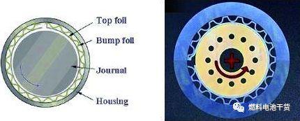 空压机分类 不同类型空压机机械及性能特点 目前,常用的燃料电池用空压机主要有离心式、罗茨式、螺杆式三种。 离心式空压机 离心式空压机通过旋转叶轮对气体做功,在叶轮与扩压器流道内,利用离心升压和降速扩压作用,将机械工转化为气体内能。具有结构紧凑、响应快、寿命长和效率高的特点。但离心式空压机工作区域窄,在低流量高压比时会发生喘振现象,严重影响寿命。 离心式空压机通常有两种方案,一种是使用增速器+滚珠轴承的方案,电机转速较低,缺点是结构复杂,需要油润滑(存在污染氧气可能),增速器寿命短;另一种是动压空气悬浮轴承,空气间隙小、起动时干摩擦,对轴承精度、耐磨性等要求高,在耐振动冲击和启停次数上有一定限制。丹麦的ROTREX空压机以提供泵头为主,其增速器如下图所示。 ROTREX空压机 目前,动压空气轴承的主要瓶颈在于涂层,下图为径向轴承示意图。空气轴承离心式空压机有两种,一种是单级压缩,工作区域窄,电机转速高,压比小;另一种为两级压缩,工作区域宽,电机转速较低,压比高。 动压空气轴承 本田FCV Clarity燃料电池汽车搭载了盖瑞特双级离心式电动空压机,实现超高压比。提高入口空压可提高进堆空气中氧气分压,有效减缓了大电流密度下电堆的电压突降现象,尽管入口空压提高导致空压机能耗增加,但空压升高后燃料电池系统净功率在大压比下也会增加。此外,提高入口压力优化了水管理能力和减少了加湿器体积。据报道,国内势加透博也实现了双级离心式空压机的量产。关于两级增压原理,请查阅本田Clarity燃料电池空压机两级增压大揭秘。 盖瑞特燃料电池两级离心式空压机 罗茨式空压机 罗茨式空压机转子间容腔不发生变化,依靠把空气挤压到外部较小容腔内,外部容腔空气密度不断升高,从而产生压力,称之为“外压缩”。罗茨式采用转子和泵壳间容积压缩的方式,转子和泵壳之间间距小于1mm,热胀冷缩容易卡壳,对泵壳机械强度要求高。罗茨式转子采用挤压生成,外压缩对转子精度及耐磨性不高,生产成本低。由于采用滚珠轴承,采用机油润滑方式。 罗茨式空压机工作范围宽广,适应于全功率燃料电池发动机。但是罗茨式空压机高频噪音很大,每个工况点噪音频谱不同,需要针对性设计消音器。丰田在早期FCV车型使用涡旋式空压机,Mirai改为六叶罗茨式空压机。针对噪音问题,在空压机出气口内增加了中冷器来降低噪音,如下图所示。 丰田第一代Mirai六叶罗茨式空压机 双螺杆式空压机 双螺杆式空压机在螺杆之间形成压缩腔,公母螺杆之间容腔逐渐缩小,气体压力从而逐渐升高,可称之为“内压缩”。内压缩对空气质量要求较高,空气中颗粒会磨损螺杆造成密封问题,螺杆上一般有耐磨涂层。内压缩易形成高压缩比,高压比时功耗相对离心式罗茨式功耗低。对螺杆形状和轴承精度要求高,采用滚珠轴承,采用机油润滑方式。 与罗茨式空压机类似,双螺杆式空压机工作范围宽广,也适应于全功率燃料电池发动机,空压机高频噪音较大,每个工况点噪音频谱不同,需针对性设计消音器。据报道,目前市场上燃料电池双螺杆空压机仅福建雪人实现量产。 雪人双螺杆空压机 关于机油问题,目前主要从两方面减少机油渗透到空气端。一方面,机油腔为开式容腔,通过排气塞排出机油蒸汽,同时保持压力(等于大气压)低于空气侧;另一方面,为防止轴承静止时机油渗透,机油液面一般低于轴承。实际中,只要采用机油润滑方式,则漏油风险就会存在,且空压机出口的机油含量较难测量。 空压机选型 电堆与空压机Map匹配
