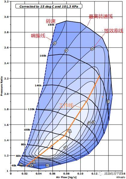 在MAP图上可以看到空压机工作线和转速线相交,相交位置的转速线斜率绝对值越小,工况稳定性越差。