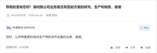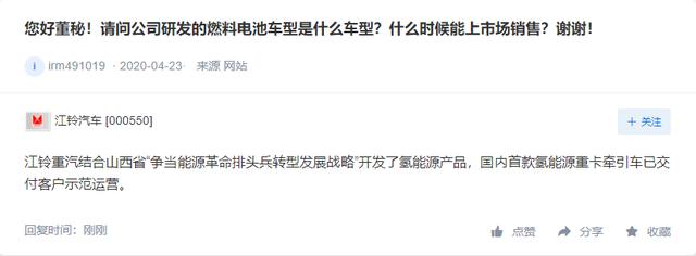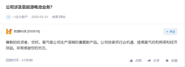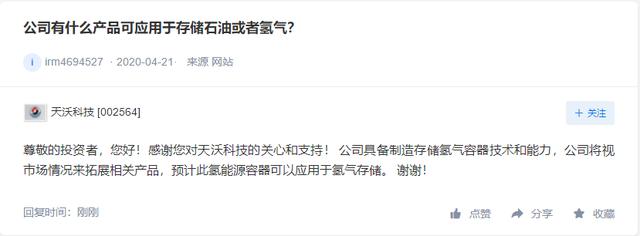 「氢问董秘」是氢云链旗下的全新栏目,主要包含投资者在互动平台上针对氢能、燃料电池等内容方面进行提问和相关企业的回复,每天一期。在这里,你可以全面了解企业的氢能发展动态。 天沃科技问: 公司有什么产品可应用于存储石油或者氢气? 天沃科技答: 尊敬的投资者,您好!感谢您对天沃科技的关心和支持! 公司具备制造存储氢气容器技术和能力,公司将视市场情况来拓展相关产品,预计此氢能源容器可以应用于氢气存储。 谢谢! 江铃汽车问: 您好董秘!请问公司研发的燃料电池车型是什么车型?什么时候能上市场销售?谢谢! 江铃汽车答: 江铃重汽结合山西省“争当能源革命排头兵转型发展战略”开发了氢能源产品,国内首款氢能源重卡牵引车已交付客户示范运营。 航锦科技问: 公司涉及氢能源电池业务? 航锦科技答: 尊敬的投资者,您好。氢气是公司生产液碱的重要副产品。公司将紧抓行业机遇,提高氢气的利用率和经济效益。非常感谢您的关注。 科恒股份问: 尊敬的董秘您好!请问我公司业务是否有氢能方面的研究、生产和销售,谢谢 科恒股份答: 您好,公司有氢燃料电池生产用的涂布设备的业务,谢谢。 欢迎关注:“氢云链”,获得更多资讯 |