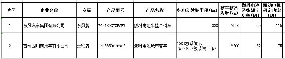 2020年5月11日,工业和信息化部税务总局联合公告了《享受车船税减免优惠的节约能源 使用新能源汽车车型目录》(第十六批)的公示,本批次共计列入224款新能源车型。 1、从产品类型看:乘用车3款;商用车221款; 其中,燃料电池汽车方面,本次燃料电池汽车共有2家2款产品上榜,上榜的燃料电池商用车种类分别为燃料电池城市客车和燃料电池半挂牵引车两种类型。 具体来看,从2款燃料电池商用车生产车企来看,分别为东风汽车集团有限公司和吉利四川商用车有限公司。 从续航里程看,2款燃料电池商用车续航里程均大于300km,其中吉利四川商用车有限公司远程牌DNC6850FCEVG2燃料电池客车燃料电池城市客车续航里程较长,加氢续航达到405km, 从燃料电池功率方面来看,东风汽车集团有限公司东风牌EQ4180GTZFCEV燃料电池半挂牵引车功率为60kW; 从燃料电池系统配套来看,东风汽车燃料电池半挂牵引车配套深圳氢时代新能源科技有限公司,而吉利四川商用车燃料电池客车则配套浙江锋源氢能科技有限公司动力系统。 |