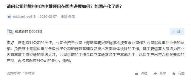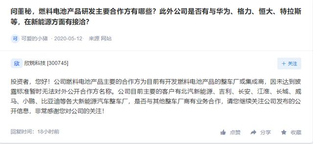 | 「氢问董秘」是氢云链旗下的全新栏目,主要包含投资者在互动平台上针对氢能、燃料电池等内容方面进行提问和相关企业的回复,每天一期。在这里,你可以全面了解企业的氢能发展动态。 金能科技问: 请问一季度焦炭的业绩怎么样,公司有投资其他氢能源的相关战略吗? 金能科技答: 尊敬的投资者,公司一季度业绩情况已在2020年第一季度报告中进行公告,公司目前除青岛项目外,无其他投资氢能源的计划。 欣锐科技问: 问董秘,燃料电池产品研发主要合作方有哪些?此外公司是否有与华为、格力、恒大、特拉斯等,在新能源方面有接洽? 欣锐科技答: 投资者,您好!公司燃料电池产品主要的合作方为目前有开发燃料电池产品的整车厂或集成商,因未达到披露标准暂时无法对外公开合作方名称。公司目前主要的客户有北汽新能源、吉利、长安、江淮、长城、威马、小鹏、比亚迪等各大新能源汽车整车厂,是否与其他整车厂商有业务合作,请您继续关注公司发布的公开信息,非常感谢您对公司的关注! 德威新材问: 请问公司的燃料电池电堆项目在国内进展如何?能国产化了吗? 德威新材答: 您好,感谢您对公司的关注。公司全资子公司上海德威明兴新能源科技有限公司作为公司燃料电池业务的总部,负责整个氢燃料电池各级分子公司的行政管理以及技术方面总体设计的工作。其主要运营人员均为在业内有丰富工作经验的高级人才。公司目前的工作是建立实验室及生产基地为主,尽快生产出符合相关要求的产品。再次感谢您对公司的关心。谢谢。 欢迎关注氢云链,获得更多氢能产业资讯。 |