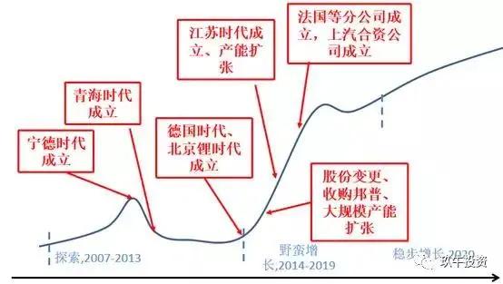 一、成为科技“独角兽”的必要条件媒体中讨论的中国的“独角兽”企业,通常是指那些估值10亿美金以上,扎堆于北上深杭、互联网产业和消费领域中有行业垄断性质的龙头企业,如蚂蚁金服、滴滴打车、拼多多。 本文讨论的“独角兽”企业是指实体经济中,那些高速度发展、高市场份额的新兴科技企业。由于科技公司成长具有估值与价值的反身性,即早期市场估值(价格)通常会滞后于公司价值,因此,科技企业早期大多默默无闻,不像互联网公司可以通过流量快速引人瞩目。通常用于评估互联网公司价值的指标,如流量、月活,转化率等并不适合分析科技类公司。 本文根据技术驱动类科技企业发展规律和对电池产业变迁规律的理解,提出一个六维度的简化模型,即TTPCIS模型:技术(technology)、时机(timing)、产品(product)、文化(culture)、创新(innovation)、战略(strategy)用以评估或分析科技类独角兽企业的竞争优势和价值创造能力。具体而言,包括以下六点。(1)技术维度,包括核心技术研发、路线设计和管理体系;(2)产品维度,包括产品深度,即质量、体验,也包括产品广度,即品类创新和切换能力,存在适用于主流市场的爆品;(3)文化维度,指企业文化和人才激励是否与互联网信息化、数字化时代创新人才激励相匹配;(4)创新维度,包括企业正向技术研发能力,学习、模仿和二次技术开发的创新能力;(5)战略维度,从战略定位角度评估,强调的是企业适应环境、正确进行战略选择和组合的能力;(6)时机维度,产业发展不同阶段所提供的创业、收购等机会窗口期,也叫“产业红利”。“独角兽”企业通常是产业不同阶段“产业红利”的最大受益者。 需要说明的是,本文的TTPICS模型适用于科技创新型企业价值评估,是科技“独角兽”的必要条件,不是充分条件,换句话说,同时拥有六个竞争优势的科技企业才有可能成为“独角兽”。 图表1 科技创新类企业评估模型 资料来源:玖牛投资 根据TTPCIS模型,本文从如下六个方面分析CATL和本文涉及的其它动力电池企业。 二、不明则矣,一鸣惊人1)技术基因、体系完整 由于母公司新能源科技有限公司(ATL)对动力电池投入有些犹豫,相比其它动力电池公司,如比亚迪、比克、力神,CATL起步较晚。2012年以前,CATL仅仅作为ATL一个事业部,专门研发、制造动力电池,研发部门和管理部门甚至还是处在共用状态(直到2016年才正式将二者业务分离)。2012年以后,图表2可见,在市场趋势确立情况下,ATL的部分管理层和民族资本才正式结合,共同正式创立了CATL。脱胎于ATL母体的CATL天然的继承了ATL在管理、文化、技术创新管理方面的基因。 成立于1999年的ATL,是较早进入全球消费电子产业链的民营企业,公司业务主要聚焦聚合物锂离子电池(应用于电子产品小型电池)研发生产,多年苦心经营,ATL锂离子电池质量和技术水平均达到全球领先地位,在2012年实现了出货量全球第一,成为全球主要聚合物锂离子电池供应商,达到了能够与日、韩锂电池巨头分庭抗礼的设计和制造能力。 图表2 宁德时代的发展历程 来源:宁德时代官网、玖牛投资 ATL深知掌握核心技术对一家科技企业生存的重要性,如图表3所示,ATL在先进材料、模拟仿真、测试验证、整合设计、智能制造方面投入巨大,是国内较早具有完整锂电池研发和制造体系的先导企业。在与苹果公司多年合作的过程中,ATL锐意进取,逐步在产业链的各个关键环节建立了完善的新技术研发、制造体系。CATL借助ATL的研发体系、制造体系、管理体系,实现自身高效运转;也为日后CATL二次创业、自主攻克汽车动力电池技术难关,建立“技术壁垒”提供了 图表3 时代新能源研发体系 来源:时代新能源官网、玖牛投资 2)自主研发、二次创新 在CATL还是ATL事业部之时,公司就花巨资投入研发,聘请了大量博士、硕士开展技术研究。CATL青出于蓝而胜于蓝,独立经营之后,在研发上更是不遗余力,如图表4显示,CATL在产品研究、技术改造上投入逐年增加,投入水平远超行业平均水平。在此基础上,在创始人曾毓群博士带领下,CATL不负众望,在短短几年,快速成长,于2016年收入就超过了ATL,成为动力电池领域龙头企业。 图表4 宁德时代与主要动力电池上市公司研发投入情况 来源:宁德时代招股书 众所周知,动力电池研究涉及多个新材料行业的基础研究,技术研发周期长、难度大,也没有现成的技术可以参照,CATL能够短时间内自主研究成功是不是因为吸收了ATL的聚合物锂电池技术路线?为解开这个疑惑,笔者比较研究了动力电池和3C数码电池区别后发现,二者技术基础不同(图表5)。虽然CATL制造的动力锂电池与ATL制造的聚合物锂电池都属锂电池,但二者仍然存在很大差异,比如在电池外形、性能、制造灵活性方面差异巨大,在材料体系方面也完全不同,3C电池以钴酸锂材料为基础,采取高电压,高密度路线,动力电池以三元和磷酸铁锂材料为基础,采取长寿命、高安全为路线。 图表5 汽车动力电池和小型电子设备(3C)锂电池产品差异 资料来源:玖牛投资 面对新的材料体系、生产方式需要新的电池材料、生产工艺,CATL采用对外广泛合作策略,和电池材料厂商、设备厂商合作开发,共同进步,推动国内锂电产业技术全面升级。先导智能、科达利、璞泰来等一批供应商见证了CATL发展和进步,也与CATL一起成长,分享市场红利,逐渐形成了“宁德产业链“。随着CATL逐步成长,中国锂