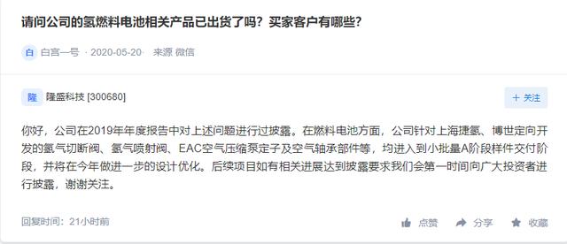 | 「氢问董秘」是氢云链旗下的全新栏目,主要包含投资者在互动平台上针对氢能、燃料电池等内容方面进行提问和相关企业的回复,每天一期。在这里,你可以全面了解企业的氢能发展动态。 云煤能源问: 张董好,请问公司有制氢设备正在使用着吗? 云煤能源答: 尊敬的投资者您好,公司不生产氢气,公司目前也没有制氢设备。 中国汽研问: 公司如何布局新能源车? 中国汽研答: 您好,感谢您的关注!公司在新能源领域,积极参与新标准的研究和起草工作,开展人力资源培训和完善并扩大业务能力,围绕电动化、智能化、网联化和共享化重点领域,成立了新能源汽车中心,正筹建首个国家氢能动力质量监督检验中心,建成后将提升新能源汽车(含燃料电池汽车)关键部件、动力系统及整车的测评及优化开发能力,深化新能源领域的业务开拓,同时公司打造的新能源汽车预警监测平台依托大数据、云计算、人工智能等新兴技术,可通过对车辆的实时监控,实现车辆故障分级报警,让用车更有保障。 隆盛科技问: 请问公司的氢燃料电池相关产品已出货了吗?买家客户有哪些? 隆盛科技答: 你好,公司在2019年年度报告中对上述问题进行过披露。在燃料电池方面,公司针对上海捷氢、博世定向开发的氢气切断阀、氢气喷射阀、EAC空气压缩泵定子及空气轴承部件等,均进入到小批量A阶段样件交付阶段,并将在今年做进一步的设计优化。后续项目如有相关进展达到披露要求我们会第一时间向广大投资者进行披露,谢谢关注。 欢迎关注氢云链,获得更多氢能产业资讯。 |