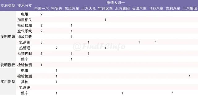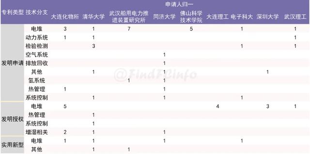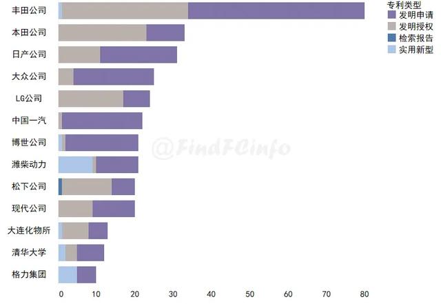 图1-2 燃料电池专利4月公开/授权的技术分布 1.3 申请人专利申请情况 将专利申请人经过标准化处理后,对标准化申请人的专利申请数量进行统计,如图1-3所示。本月,丰田公司公开专利80件,其中发明申请和发明授权数量分别为46、33件;本田公司和日产公司的专利公开数量分别为33、31件;博世公司和潍柴动力本月公开专利数量均为21件,其中博世公司的专利技术主要涉及电堆(催化剂、密封)、氢系统、动力系统,潍柴动力的专利技术主要涉及空气系统、系统控制、热管理等;格力集团本月公开专利10件,其专利技术主要涉及电堆、增湿等,其中电堆以双极板相关技术为主。 图1-3 标准化申请人专利4月公开/授权排名 在燃料电池检验检测方面,本月公开燃料电池气密性检测相关专利的企业有中国一汽、锋源氢能、上海电气、深圳世椿等;公开燃料电池氢系统测试相关专利的企业有上海舜华新能源、中汽研汽车检验中心、佛山清极等;公开燃料电池故障、缺陷、寿命检测相关专利的企业有潍柴动力、深圳世椿、北京航天智造。 二、国内申请人专利公开情况2.1 国内整车厂4月专利公开情况 国内整车厂在4月的专利公开情况如图2-1所示。其中,中国一汽公开22件专利,主要涉及双极板、气体扩散层、空气系统、检测检验等;格罗夫公开了6件专利,主要涉及热管理、车用去离子器等;东风汽车在本月公开相关专利5件,主要涉及燃料电池汽车冷却系统控制、能量管理、氧气供应等。其他在4月公开相关专利的整车厂还包括上汽大众、宇通客车、北汽集团、长城汽车、飞驰汽车、吉利汽车、广汽集团、奇瑞汽车、金龙客车等。 图2-1 整车厂4月专利公开情况 2.2 燃料电池企业4月专利公开情况 国内燃料电池企业在4月的专利公开情况如图2-2所示。其中,上海神力公开专利8件,主要涉及低温启动、停机方法以及活化等技术;中国华能集团清洁能源技术研究院有限公司公开专利6件,主要涉及熔融碳酸盐燃料电池相关技术;其他在4月公开相关专利的企业还包括河南豫氢、浙江高成绿能、舜华新能源、新源动力、雄韬氢雄、武汉中极氢能等。 图2-2 燃料电池企业4月专利公开情况 2.3 科研院所(校)4月专利公开情况 燃料电池相关科研院所(校)在4月的专利公开情况如图2-3所示。其中,中科院大连化物所公开专利13件,其技术主要涉及膜电极相关组件制备、双极板、增湿器等;清华大学公开专利12件,其技术主要涉及燃料电池状态检测、系统控制等;佛山科学技术学院本月公开专利5件,主要涉及催化电极制备;其他在4月公开相关专利的科研院所(校)还包括:武汉船用电力推进装置研究所、同济大学、大连理工大学、电子科技大学、深圳大学、武汉理工大学等。 图2-3 燃料电池科研院所(校)4月专利公开情况 来源:燃料电池专利情报 |