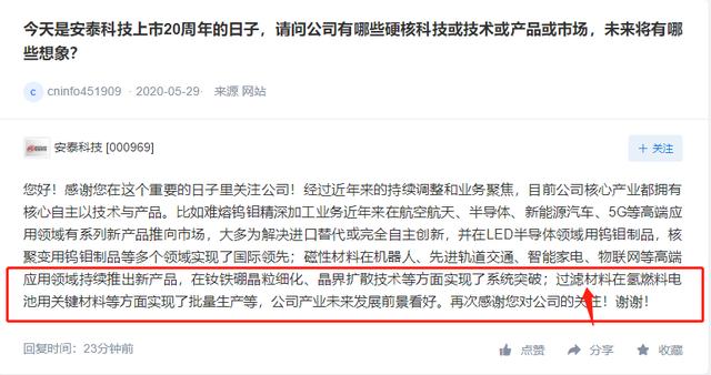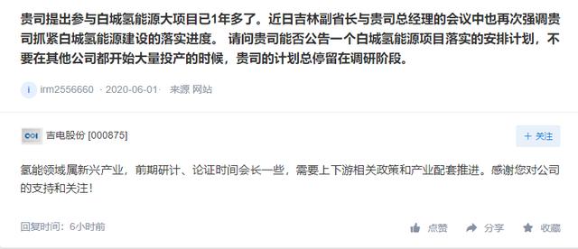 「氢问董秘」是氢云链旗下的全新栏目,主要包含投资者在互动平台上针对氢能、燃料电池等内容方面进行提问和相关企业的回复,每天一期。在这里,你可以全面了解企业的氢能发展动态。 安泰科技问: 今天是安泰科技上市20周年的日子,请问公司有哪些硬 安泰科技答: 您好!感谢您在这个重要的日子里关注公司!经过近年来的持续调整和业务聚焦,目前公司核心产业都拥有核心自主以技术与产品。比如难熔钨钼精深加工业务近年来在航空航天、半导体、新能源汽车、5G等高端应用领域有系列新产品推向市场,大多为解决进口替代或完全自主创新,并在LED半导体领域用钨钼制品,核聚变用钨钼制品等多个领域实现了国际领先;磁性材料在机器人、先进轨道交通、智能家电、物联网等高端应用领域持续推出新产品,在钕铁硼晶粒细化、晶界扩散技术等方面实现了系统突破;过滤材料在氢燃料电池用关键材料等方面实现了批量生产等,公司产业未来发展前景看好。再次感谢您对公司的关注!谢谢! 雄韬股份问: 公司在燃料电池叉车领域是否有相关布局? 雄韬股份答: 您好!目前公司暂未在燃料电池叉车领域有相关布局。谢谢! 吉电股份问: 贵司提出参与白城氢能源大项目已1年多了。近日吉林副省长与贵司总经理的会议中也再次强调贵司抓紧白城氢能源建设的落实进度。 请问贵司能否公告一个白城氢能源项目落实的安排计划,不要在其他公司都开始大量投产的时候,贵司的计划总停留在调研阶段。 吉电股份答: 氢能领域属新兴产业,前期 欢迎关注氢云链,获得更多氢能产业资讯。 |