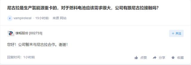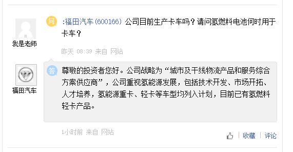 | 「氢问董秘」是氢云链旗下的全新栏目,主要包含投资者在互动平台上针对氢能、燃料电池等内容方面进行提问和相关企业的回复,每天一期。在这里,你可以全面了解企业的氢能发展动态。 福田汽车问: 公司目前生产卡车吗?请问氢燃料电池何时用于卡车? 福田汽车: 尊敬的投资者您好。公司战略为“城市及干线物流产品和服务综合方案供应商”,公司重视氢能源发展,包括技术开发、市场开拓、人才培养,氢能源重卡、轻卡等车型均列入计划,目前已有氢燃料轻卡产品。 广东鸿图问: 据新闻报道,国电投公司近期前往宝龙汽车进行调研,国电投公司作为国家氢能产业应用重大项目公司,近期在氢能领域动作频频,已成立下属氢能公司,请问是否未来公司宝龙汽车也会参与和跟进国电投氢能产业项目? 广东鸿图答: 您好,宝龙汽车暂无相关计划。 雄韬股份问: 尼古拉是生产氢能源重卡的,对于燃料电池应该需求很大,公司有跟尼古拉接触吗? 雄韬股份答: 您好!公司暂未与尼古拉合作。谢谢! 欢迎关注氢云链,获得更多氢能产业资讯。 |