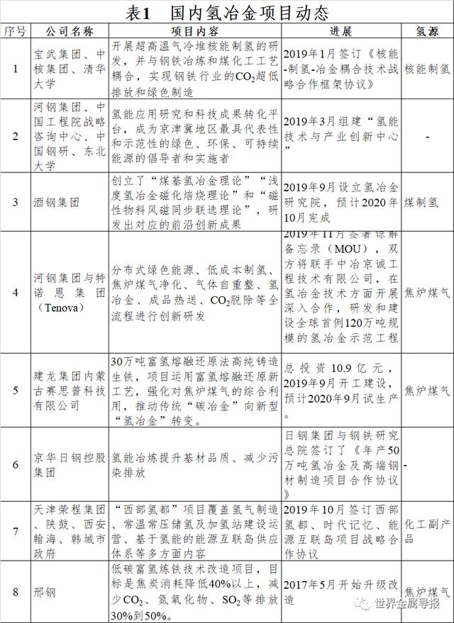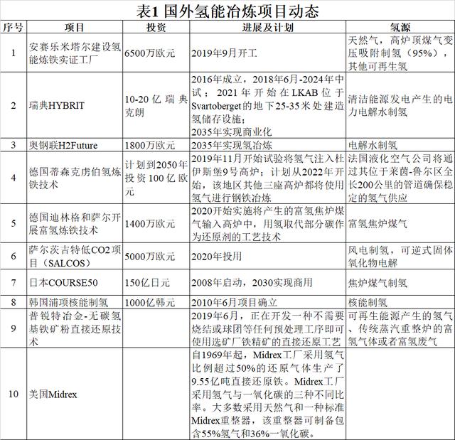 | 1、前言 氢能因其清洁低碳、热值高、来源广泛和安全可控的特点,逐渐成为全球能源技术创新和产业变革的推动力,重塑绿色生态能源消费结构的重要二次能源。氢存在于各种物质中,是可再生能源,储量充裕且高效,应用前景非常广阔。氢能作为高能量密度、无污染排放的二次能源,是有效耦合传统化石能源和可再生能源,构建清洁低碳、安全高效现代能源体系的重要选择。 钢铁行业是资金、技术、能源密集型行业,每生产一吨钢需排放1.8吨CO₂。在全球严格的资源和环保政策约束大背景下,钢铁行业面临着巨大的环保压力。过去十年间,世界主要产钢国开始致力于开发能够显著降低CO₂排放的突破性低碳炼钢技术,其中氢冶金应运而生,以氢代替碳是当前低碳发展、能源变革的重要方向,也是钢铁行业绿色低碳、高质量发展的主要出路。 2、国内外氢冶金发展 2.1.1 我国氢冶金工艺发展进展 我国氢冶金工艺起步较晚,国内钢铁企业近年来开始纷纷布局氢冶金领域,其中典型的项目如表1所示。氢冶金技术的开发推广,不仅能够从根本上实现钢铁生产的近零排放,而且还可以解决我国高精尖钢材性能低、质量不稳定等问题,并对我国钢铁产业升级和高质量发展具有重要实践意义。 2.1.2 中国宝武与中核集团、清华大学核能-制氢-冶金耦合技术合作 2019年1月,中国宝武与中核集团、清华大学签订《核能-制氢-冶金耦合技术战略合作框架协议》,核能制氢将核反应堆与采用先进制氢工艺耦合,进行氢的大规模生产,并用于冶金和煤化工。以世界领先的第四代高温气冷堆核电技术为基础,开展超高温气冷堆核能制氢的研发,并与钢铁冶炼和煤化工工艺耦合,依托中国宝武产业发展需求,实现钢铁行业的二氧化碳超低排放和绿色制造。 经初步计算,一台60万千瓦高温气冷堆机组可满足180万吨钢对氢气、电力及部分氧气的能量需求,每年可减排约300万吨CO₂,减少能源消费约100万吨标准煤,将有效缓解我国碳排放压力,助力解决能源消费引起的环境问题。目前,我国已建成并运行10兆瓦高温气冷实验堆,20万千瓦高温气冷堆商业示范电站预计将于2020年建成投产,中核集团联合清华大学已启动60万千瓦高温气冷堆商用核电站的项目实施工作,并已基本完成其标准设计和评审,已启动厂址选择工作。 2.1.3 河钢集团建设全球首例120万吨规模的氢冶金示范工程 2019年11月,河钢集团与意大利特诺恩集团(Tenova)签署谅解备忘录(MOU),商定双方在氢冶金技术方面开展深入合作,利用世界最先进的制氢和氢还原技术,并联合研发、建设全球首例120万吨规模的氢冶金示范工程。该项目将从分布式绿色能源、低成本制氢、焦炉煤气净化、气体自重整、氢冶金、成品热送、二氧化碳脱出等全流程进行创新研发,探索出一条世界钢铁工业发展低碳、甚至“零碳”经济的最佳途径,从改变能源消耗结构入手,解决钢铁冶金过程环境污染和碳排放问题,从而引领传统钢铁冶金工艺变革。 自2019年7月以来,双方围绕基于氢能的新型冶金技术研发与应用,开展多层次的交流与调研,重点就以氢代碳冶金的关键技术问题、工艺路线、资源和能源条件等内容进行深入交流,达成合作意向。下一步双方将在谅解备忘录框架下,以河钢集团实施转型升级战略为契机,以意大利特诺恩集团氢还原技术为基础,建立协同创新机制,共同开展基于氢能冶金技术的全生命周期合作。据了解,双方技术团队将围绕分布式绿色能源利用、氢气制备与存储、氢冶金、二氧化碳脱出等领域的关键技术,共同研发以氢能为核心的新型钢铁冶金生产工艺。充分利用太阳能、风能等分布式可再生绿色能源,结合应用工业气体制氢和电解水制氢等先进技术,共同打造世界上第一条氢冶金示范工程生产线。 2.1.4 酒钢成立氢冶金研究院 2019年9月,酒钢集团公司氢冶金研究院揭牌成立,标志着酒钢率先确立了在同行业氢冶金研究及产业化落地方面的“领跑”地位,是酒钢实施创新驱动及资源保障战略,实现高质量发展的重要举措。氢冶金研究院的成立基于酒钢技术团队在煤基氢冶金及干磨干选研究方面获得的一系列重大科学发现,并创立了“煤基氢冶金理论”“浅度氢冶金磁化焙烧理论”和“磁性物料风磁同步联选理论”,研发出对应的前沿创新成果。酒钢将以自主知识产权技术为核心申报国家级“酒钢制铁短流程”示范项目,全面建成国家级“酒钢煤基氢冶金+干磨干选制铁短流程”示范基地,并建成以煤基氢冶金及干磨干选技术为核心的酒钢“成果研发+工程咨询”新的产业板块。 目前,酒钢正在建设世界上首套煤基氢冶金中试装置及配套的干磨干选中试装置,并于2020年5月取得热负荷试车初步成功,该项目热负荷试车以高炉瓦斯灰为原料,回转窑投料运行后料层碳气化反应良好,瓦斯灰在回转窑内被有效还原,并形成了金属化块料,回转窑未出现结圏现象,整个工艺过程平稳受控。项目主工艺系统的功能、参数得到初步验证,后期需要对部分设备设施进行消缺和功能完善,逐步达到项目既定目标,预计2020年10月底建成投运。 2.1.5建龙集团建设年产30万吨富氢熔融还原高纯铸造生铁项目 内蒙古赛思普科技有限公司(隶属建龙集团)总投资10.9亿元的富氢熔融还原法高纯铸造生铁项目预计2020年9月底实现试生产,项目规模为年产30万吨。该项目运用富氢熔融还原