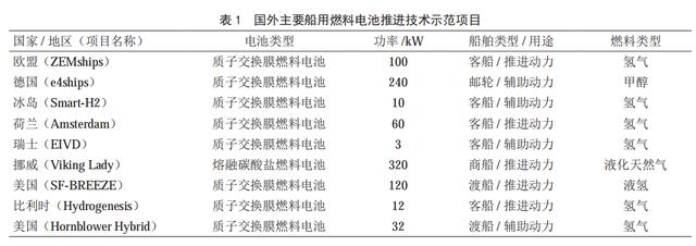 本文介绍了船用氢燃料电池推进技术发展的必要性、国内外现状、问题及技术需求。与国外先进国家相比存在差距: 船用氢燃料电池推进装置的战略与目标亟待确立;氢燃料电池船舶领域法规规范研究不足;船用氢燃料电池推进技术工程化 的部分关键技术有待突破;船用氢燃料电池配套基础设施建设缺乏。最后提出了我国船用氢燃料电池推进技术发展思路与建 议,分析了船用氢燃料电池推进技术的应用前景。 一、前言 船舶是为航运业、海洋开发及国防建设提供技 术装备的综合性产业,对钢铁、石化、纺织、装备 制造、电子信息等重点产业发展和扩大出口具有较 强的带动作用,是国家实施海洋强国和制造强国战略的重要支撑。《中国制造 2025》已将高技术船舶 列为十大重点发展领域之一。 船舶的传统动力推进装置,如柴油机、蒸汽轮 机、燃气轮机等,通过消耗柴油来产生动力,存在 如下主要问题:燃料能量转换效率低(约 35%); 柴油机的振动噪声等级高,极大降低了船舶的舒适度;燃料燃烧产生大量温室气体、氮氧化物、硫氧 化物和颗粒物,造成严重的生态环境污染;化石能 源是非可再生能源,而且现有的化石能源储量有限, 不能支撑人类的持久发展 [1~5]。因此,研究清洁、 高效、可持续发展的新能源动力推进技术已经成为 绿色船舶的重要发展方向。 氢燃料电池是 21 世纪绿色动力能源技术制高 点,是一种将自身携带氢燃料与氧化剂中的化学能 经电化学反应直接转化为电能的发电装置,具有能 量转化效率高、能量密度高、振动噪声低和零排放 等优点 [6~8]。此外,氢是可再生能源,可通过太 阳能、风能、水势能、生物能等绿色能源制氢获得。 因此,氢燃料电池推进技术在船舶上应用可实现能 源高效、零排放和船舶舒适度提升,是绿色船舶的 理想动力推进装置,适应绿色船舶市场需求。 二、国外船用氢燃料电池推进技术的应用现状 (一)规划与标准 北美、日本、韩国等先进国家和地区已将船用 氢燃料电池推进技术作为政府重点支持方向,相继 颁布一系列规划与标准,引导并支持氢燃料电池船 舶产业发展。 北美:对氢能的研发始于 1973 年的石油危机, 当时成立了国际氢能协会,并在美国迈阿密海滩召 开了有关该主题的第一界国际会议,美国能源研究 开发署(ERDA)对氢能研究计划加以扶持,作为 对美国政府能源自给不成功计划部分的一种弥补。 2015 年,美国能源局向国会提交了《2015 年美国 燃料电池和氢能技术发展报告》,大力投资发展先 进氢燃料电池技术。2016 年,美国能源部报告称,正联合制定环境、安全、许可等方面的船用氢燃料 电池和加氢站行业规范。 日本:2009 年国土交通省制定的《对于船舶行 业中长期科研计划》中便提到将燃料电池作为船舶 电力推进系统来减少排放。得益于日本燃料电池领 域的技术优势,其在船用领域虽起步晚但发展较快。 2017 年,日本船级社发布液氢运输船安全建造运营 导则,填补了目前海事规则规范在氢燃料动力领域 的空白。 韩国:知识经济部在 2010 年制定的《造船产 业中长期发展战略规划》中便提到将燃料电池等绿 色能源应用到船舶行业中。2015 年,政府推出的 燃料电池船舶项目共投入 160 亿韩元,由韩国船级 社牵头进行相应的研发。韩国的大型船厂与企业如 大宇造船海洋(山东)有限公司、浦项制铁电力公 司(POSCO Power)、三星重工有限公司、System Technology Excellence(STX)造船集团都参加了政 府牵头的船用燃料电池研发项目或自主研发。 (二)示范与应用现状 欧盟、德国、美国、挪威、日本等先进国家 和地区在船用氢燃料电池推进技术领域处于领先地 位,已实现船用氢燃料电池动力推进装置的示范及 应用,进入推广应用阶段。国外主要船用燃料电池 推进技术示范项目如表 1 所示。 欧盟:在 2007 年资助世界上第一个商业客轮 ZEMships 项目,该船采用混合动力推进方式,整 合了两个峰值功率 48 kW 的氢燃料电池和 560 V 的 铅蓄电池,可运送 100 名乘客。 德国:在 2008 年研制出 100 客“Alsterwasser” 号氢燃料电池游船,其采用氢燃料电池动力推进装置作为主推进动力,功率达到 100 kW,最高航速 可达到 14 km/h,目前实现载客共 14 000 余名。 法 国: 在 2017 年建成氢 – 风 – 光动力船 “Energy Observer”号,该船长 30 m,重 20 t,采 用氢燃料电池系统 22 kW。 荷 兰: 在 2009 年建成 100 客“Fuel Cell Boat Amsterdam”用于运河旅游事业,该船配备 60~70 kW 氢燃料电池系统,采用高压氢气提供氢燃 料,能够以 7 节(1 节 =1 n mile/h)航速航行 9 h。 美国:在 2018 年 6 月 25 日宣布,将在海湾地 区建造第一艘氢燃料电池渡轮。该渡轮载客 84 名, 电力推进动力功率是 2×300 kW,长 21 m,铝质船 体,航速为 22 节。 挪威:在 2009 年与瓦锡兰集团、MTU 船级社 合作研制出著名的氢燃料电池海面补给船“Viking Lady”号,该氢燃料电池系统功率为 320 kW,燃 料为液化天然气,是全球第一艘投入运营的氢燃料 电池工程船舶。 日本:在 2015 年下水试航首款氢燃料电池 渔船,该渔船全长 12.5 m,可乘坐 12 人,可搭载 450 L 氢燃料,最高速度可达 37 km/h。 三、我国船用氢燃料电池推进技术的应用现状 氢燃料电池推进技术可作为推进动力和辅助动 力装置,应用于内河、内湖和近海的游船和游艇, 满足该类型船舶对节能减排、绿色环保和提升船舶 舒适度的需求;作为推进动力和辅助动力装