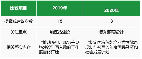 本期要点 近几年来,政府部门对氢能行业的引导加强,加速了氢能产业化进程,目前我国初步形成以交通应用为主的氢能和燃料电池产业链。然而,随着氢能产业大规模商业化的推广,氢能产业除了面临着核心技术壁垒和成本的问题外,氢能管理顶层设计仍然处于空白状态。面对行业日渐高涨的呼声,今年国家对氢能顶层设计的态度进一步明确,多个重磅级政策利好释放。两会过后,2020年国民经济和社会发展计划明确提出要“制定国家氢能产业发展战略规划”,这意味着氢能方面的顶层设计将在不久的将来落实到位,行业发展再获助力。 独家解读 01、两会氢能“声音”减少 但集中度加强