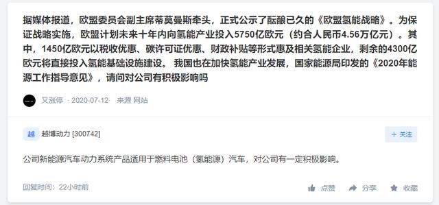 | 「氢问董秘」是氢云链旗下的全新栏目,主要包含投资者在互动平台上针对氢能、燃料电池等内容方面进行提问和相关企业的回复,每天一期。在这里,你可以全面了解企业的氢能发展动态。 洲际油气问: 你们有氢能源业务吗?旗下控股公司有可能科创板上市吗? 洲际油气答: 公司今年加大、加快了对氢能源的投资,收购并控股了世能氢电,目前世能氢电就氢能源项目已经申请了5项专利,另有5项专利正在申报中。洲际新能在2018年已在美国投资了液态金属储能项目。旗下控股公司在条件成熟并符合有关法律法规的情况下,公司可以考虑采取在科创板分拆上市等措施。谢谢您的关注! 潍柴动力问: 请问,潍柴动力 在富氢燃料电池方面有没有技术储备?富氢我指定的是非纯氢气,而是指氨(NH3)这类。。。。。。。 潍柴动力答: 目前公司主要布局氢燃料电池和固态氧化物燃料电池等相关技术。感谢您对公司的关注! 越博动力问: 据媒体报道,欧盟委员会副主席蒂莫曼斯牵头,正式公示了酝酿已久的《欧盟氢能战略》。为保证战略实施,欧盟计划未来十年内向氢能产业投入5750亿欧元(约合人民币4.56万亿元)。其中,1450亿欧元以税收优惠、碳许可证优惠、财政补贴等形式惠及相关氢能企业,剩余的4300亿欧元将直接投入氢能基础设施建设。 我国也在加快氢能产业发展,国家能源局印发的《2020年能源工作指导意见》,请问对公司有积极影响吗 越博动力答: 公司新能源汽车动力系统产品适用于燃料电池(氢能源)汽车,对公司有一定积极影响。 欢迎关注氢云链,获得更多氢能产业资讯。 |