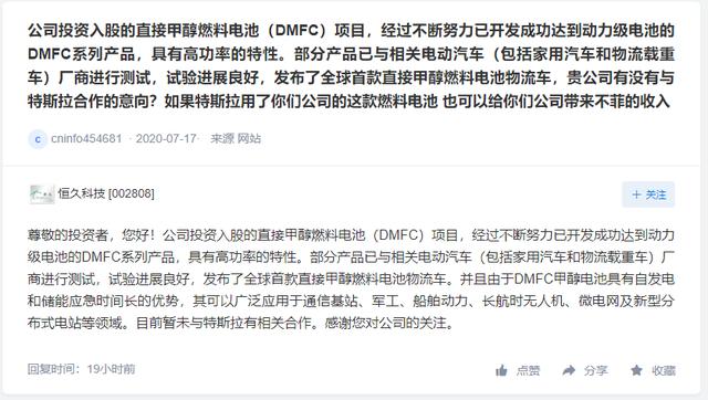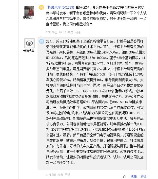 | 「氢问董秘」是氢云链旗下的全新栏目,主要包含投资者在互动平台上针对氢能、燃料电池等内容方面进行提问和相关企业的回复,每天一期。在这里,你可以全面了解企业的氢能发展动态。 长城汽车问: 董秘你好,贵公司基于全新SUV平台的第三代哈弗H6即将发布,新平台有哪些特点和优势,请详细说明一下?个人认为丰田汽车的TNGA平台,宣传的就很成功,对于该全新平台的下一步宣传营销,贵公司有哪些规划? 长城汽车答: 您好,第三代哈弗H6基于全新的柠檬平台打造,柠檬平台是公司打造的全球化高智能模块化的技术平台。首先,柠檬平台具有很强的灵活性与可拓展性,前轮距适用范围1540-1680mm,轴距适用范围2650-3005mm,后轮距适用范围1550-1690mm,基于438个基础模块,113个标准模块打造,可覆盖A0到D级尺寸,可打造SUV、轿车、MPV等多种形态的车型,满足消费者的需求。其次,柠檬平台具有更高的性能与更优的结构,车身俯仰角减少50%,转向干扰力臂减小16%整车质心降低30mm,转向精准度提升16%,车身侧向刚度增大15%,大幅提升车辆的操控性与安全性。再次,新平台产品动力模式更加多元化,布局了高效ICE、HEV、PHEV、EV和FCV多重动力模式,4款常规高效发动机和3款混动专用发动机,提供澎湃动力,未来5年内公司自研发动机热效率将超50%,符合国六B、欧6D、SULEV20排放标准,满足环保与节能性,公司自研的7DCT以及全球首款9DCT,可实现96%以上的传动效率,混合动力方面公司也在发展混联DHT、P2、P2+P4等混动架构,新能源产品也将搭配高效电驱及电池,提升产品核心竞争力,公司也在前瞻性布局氢能源,明年将推出第一代FCEV,2023年将推出第二代FCEV,可实现超1100km的续航和4.56秒的百公里加速。最后,新平台基于全新的电子电器架构,打通智能座舱与智能驾驶,站在用户角度,创造价值,解决用户痛点,打造有温度的、有乐趣、好玩的人车交互产品,打通智能与网联,整车智能与服务智能,做一个有良好体验的智能网联系统。公司通过技术品牌发布活动,让更多的消费者和投资者认识、认知、认可公司的全新平台与全新技术。 恒久科技问: 公司投资入股的直接甲醇燃料电池(DMFC)项目,经过不断努力已开发成功达到动力级电池的DMFC系列产品,具有高功率的特性。部分产品已与相关电动汽车(包括家用汽车和物流载重车)厂商进行测试,试验进展良好,发布了全球首款直接甲醇燃料电池物流车,贵公司有没有与特斯拉合作的意向?如果特斯拉用了你们公司的这款燃料电池 也可以给你们公司带来不菲的收入 恒久科技答: 尊敬的投资者,您好!公司投资入股的直接甲醇燃料电池(DMFC)项目,经过不断努力已开发成功达到动力级电池的DMFC系列产品,具有高功率的特性。部分产品已与相关电动汽车(包括家用汽车和物流载重车)厂商进行测试,试验进展良好,发布了全球首款直接甲醇燃料电池物流车。并且由于DMFC甲醇电池具有自发电和储能应急时间长的优势,其可以广泛应用于通信基站、军工、船舶动力、长航时无人机、微电网及新型分布式电站等领域。目前暂未与特斯拉有相关合作。感谢您对公司的关注。 汉钟精机问: 尊敬的董秘您好!请问如果中芯国际测试真空产品通过,会以什么样的方式通知公司呢?如果测试通过公司也会以公告的形式告知投资者吗?除了中芯国际,长电科技等封测厂商有用公司的真空产品吗?新研发的氢能源压缩产品有小批量给用户测试了吗?最新的股东人数是多少? 汉钟精机答: 您好,公司真空泵可用于半导体的封测中使用,目前日月光、力成等都已导入。 公司在氢燃料电池产业已成功完成螺杆空气泵的开发,并已交付样机给下游客户进行测试,目前配合客户验证与产品开发中,同时正加速推进氢回收泵的研发进度,预计在2020年完成产品开发,交付客户验证使用。 根据公司2020年一季度报告内容,截至2020年3月31日,公司股东总户数为43,222户。 感谢您的关注! 欢迎关注氢云链,获得更多氢能产业资讯。 |