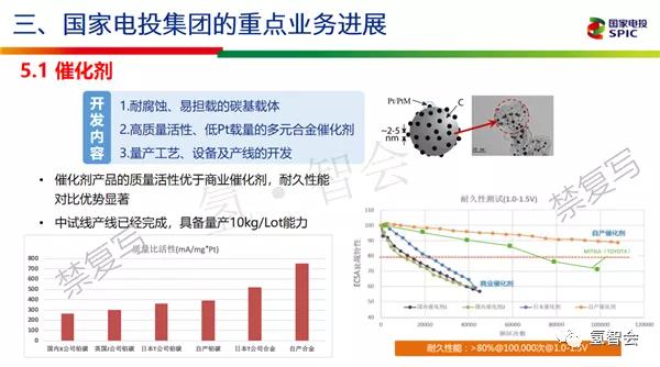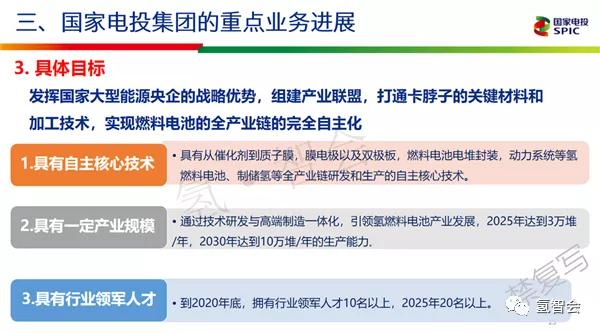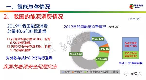 | 为有力推进我国氢能产业高质量发展,中国石化于2020年7月24日邀请国内氢能领域顶级院士、专家举行“结构氢产业,谋划氢未来”氢能发展战略研讨会。 本次研讨会对氢能发展现有问题把脉问诊,为氢能未来发展献言献智,将为推进中国石化构建“一基两翼三新”发展格局、打造世界领先洁净能源化工公司和促进我国氢能产业科学发展、健康发展、高质量发展提供咨询、把握方向。 国家电投集团氢能首席专家柴茂荣在会上做了主题演讲,内容如下: 演讲实录 谢谢马总的介绍,也谢谢各位专家今天有时间来让我有这个机会介绍我们氢能源燃料电池开发情况,以及我这30多年来做的一些工作。 我今天的报告主要分成三个部分:第一,氢能的总体情况,这部分各位院士都说的比较多,所以我就简单跳过去;第二部分,燃料电池的技术进展,就是国内外的进展;第三部分,国家电投主要做了哪些工作。 下面我先介绍一下氢能的总体情况。 国家电投是一个能源企业,所以从我们公司角度来讲,我们觉得发展氢能重要意义是保障我们国家的能源安全。 第一方面释放无碳一次能源,促进能源体系清洁低碳化;第二替代油气,降低油气进口依存度;第三,优化能源终端体系,确保能源供应自主高效。所以我们开发目标首先是自主化,打通整个产业链的自主化;第二是多样化;第三是低碳,就是用清洁能源制氢;第四,分散,因为氢作为储能应用可以把电变成氢储存,比如分布式能源这些方面;第五,智慧化,把能源有效利用率提高。我国能源消费的情况,从这个图可以看出,我们国家去年整个销售量煤大概占58%,油大概是占了9%左右,还有天然气、其他的。 我们国家石油整个对外依存度70.8%,天然气对外依存度43%,合计大概8.2亿吨标准煤是进口的。所以我们整个国家的能源安全问题是非常突出的,因为如果世界整个环境变化,我们没有能源整个国家安全就会受到威胁。 能不能用可再生能源替代进口的石油和天然气?现在可再生能源年风能大概12%左右,太阳能15%左右的年增长率,当然有的年份高一点,有的年份低一点。按照这个来算8.2亿吨标准煤的依存度如果全部用风能和太阳能的增量来算,到2035年左右大概可以完全替代我们的进口油气。 但是这里面存在着问题,可再生能源非常不稳定,比如太阳能是白天有晚上没有,风能是有风就有,没有风就没有,所以非常不稳定,需要储能。如果能源可以稳定供应大概需要30%左右的储能,而不是10%。国家能源局提出来可再生能源10%,我们现在弃掉了不少。所以30%左右就是需要15000亿千瓦时的电或者其他方式配套解决。 还有一个我们国家能源可利用情况进行了分析。水、风、太阳能储量,如果我们把太阳能代替进口油气,太阳能整个可开采量大概2.5%左右,风能大概是5%左右,这两个量是完全可以达到我们的要求的,我们国家风能大概77亿千瓦,相当于74.8亿吨标准煤。太阳能一年大概4.9万亿吨标准煤的量,我们如果用可再生能源,对我们环境负荷也是没有什么影响的。 刚才我们谈到,如果利用可再生能源来替代进口油气的话,需要5000GWh余量,我们国家动力电池2015年大概100,也就是要增长50倍,因为汽车也要用到储能,其他也要用到锂电池。但是如果用氢气储能,15000度大概是5000万吨左右的氢气,我们国家一年年产氢就两千万吨左右,用氢气储能就是现有规模2.5倍,无论是制还是储还是有希望的,所以我们认为用氢气储能还是靠谱的。 所以我们认为未来清洁能源的体系一个是电氢体系,我们认为可再生能源一部分用来直接供到电网然后工业、民用、交通、航天、船舶等其他应用;另外一方面把它作为电解氢储存起来输到管网,或者是回电或者氢气直接使用,所以我们认为终端能源主要是电氢热的三种形式,电氢为主。电氢必须要在 所以我们认为氢能是21世纪终极能源,我们就是通过太阳光把水变成了能源,水通过电解变成氢和氧,氢和氧通过燃料电池等发电又变回了水,得到了电。整个过程是完全零排放,完全是可以循环的过程。从人类社会发展情况来看,煤炭到石油、天然气、氢是从高碳到低碳到零碳,从固态到液态到气态的过程,这是社会发展的规律,所以我们认为低碳社会是一个社会的必然选择。从能源革命来讲也是一样的,第一次、第二次能源革命带来了整个蒸汽机和内燃机的革命,产生了电。到第三次能源革命我们认为氢应该是占有一个很大的角色,一方面是走向电气化社会的过程;第二方面,燃料电池、锂电池整个属于直流电,因为我们的电脑也好、LED灯也好,还有一些数据中心也好现在用的都是直流电,所以认为氢能可以代替整个能源的储存结构。 能源里面制、储、运、用四个方面,刚才很多院士也说了,我们认为这四个是非常关键的环节。其中最重要的是两条,一个是制氢,一个是用氢,制氢这块我们还是40年代的技术,用氢燃料电池还是上个世纪90年代开始的技术,所以这两方面是我们现在要重点开发的。图中打圈的是国家电投在做的,燃料电池、加氢站、电解水,还有氢安全,我们要保证绝对安全的情况下能源整个发展才能铺开。 简单把第一章小结一下。 经测算我国的能源禀赋理论上可实现2035年完全摆脱对进口油气依赖的能源战略目标。能源安全提升的策略,一是能源结构的转型,提高终端用电比例。二是提高存量和增量的能源效率,提高能源使用的集约化水平。这