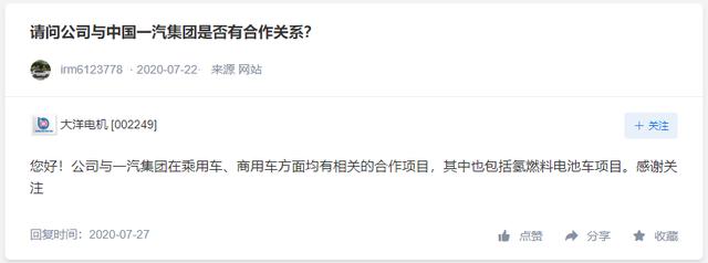 | 「氢问董秘」是氢云链旗下的全新栏目,主要包含投资者在互动平台上针对氢能、燃料电池等内容方面进行提问和相关企业的回复,每天一期。在这里,你可以全面了解企业的氢能发展动态。 陕西黑猫问: 您好,贵司是否有涉及氢能源业务?或者是新能源 陕西黑猫答: 公司不涉及氢能源业务!!! 大洋电机问: 请问公司与中国一汽集团是否有合作关系? 大洋电机答: 您好!公司与一汽集团在乘用车、商用车方面均有相关的合作项目,其中也包括氢燃料电池车项目。感谢关注 雄韬股份问: 日前河北省发改委日前印发《河北省氢能产业链集群化发展三年行动计划(2020-2022年)》中提及燃料电池实现在大型应急电源、通信基站、分布式热电联供等领域的试点示范。请问贵司的氢燃料电池目前除车载外,是否已有涉及以上应用场景? 雄韬股份答: 您好!目前公司燃料电池产品暂未涉及上述应用场景。谢谢! 欢迎关注氢云链,获得更多氢能产业资讯。 |