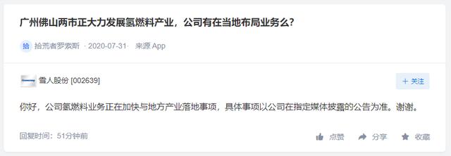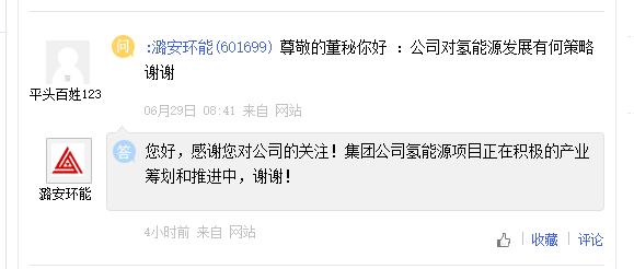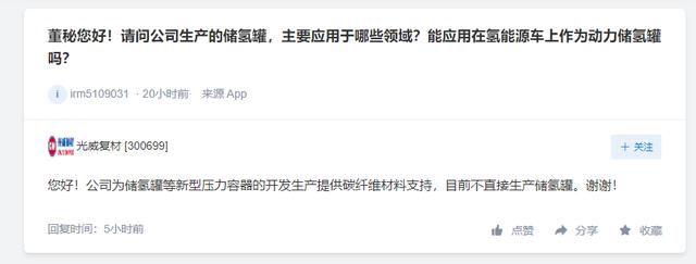「氢问董秘」是氢云链旗下的全新栏目,主要包含投资者在互动平台上针对氢能、燃料电池等内容方面进行提问和相关企业的回复,每天一期。在这里,你可以全面了解企业的氢能发展动态。 潞安环能问: 尊敬的董秘你好 :公司对氢能源发展有何策略谢谢 潞安环能答: 您好,感谢您对公司的关注!集团公司氢能源项目正在积极的产业筹划和推进中,谢谢! 光威复材问: 董秘您好!请问公司生产的储氢罐,主要应用于哪些领域?能应用在氢能源车上作为动力储氢罐吗? 光威复材答: 您好!公司为储氢罐等新型压力容器的开发生产提供碳纤维材料支持,目前不直接生产储氢罐。谢谢! 雪人股份问: 广州佛山两市正大力发展氢燃料产业,公司有在当地布局业务么? 雪人股份答: 你好,公司氢燃料业务正在加快与地方产业落地事项,具体事项以公司在指定媒体披露的公告为准。谢谢。 欢迎关注氢云链,获得更多氢能产业资讯。 |