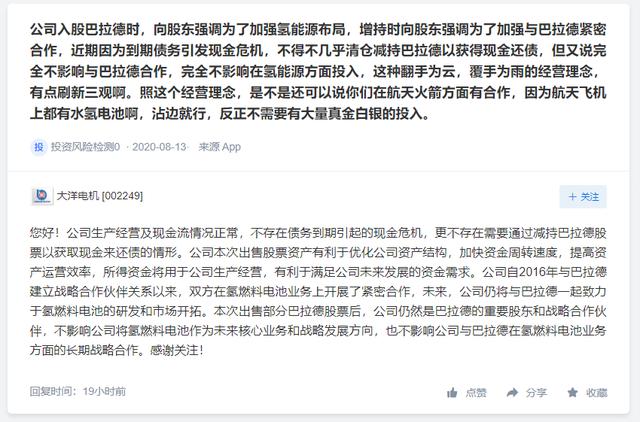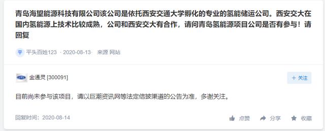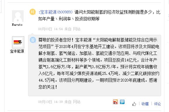 「氢问董秘」是氢云链旗下的全新栏目,主要包含投资者在互动平台上针对氢能、燃料电池等内容方面进行提问和相关企业的回复,每天一期。在这里,你可以全面了解企业的氢能发展动态。 宝丰能源问: 请问太阳能制氢的经济效益预测数据是多少,比如年产量丶利润率丶投资回收期等 宝丰能源答: 尊敬的投资者您好!宝丰能源“太阳能电解制氢储能及综合应用示范项目”于2020年4月在宁东基地开工建设。该项目将涉及太阳能电解水制氢、氢气储运、加氢站、氢能交通示范应用、与现代煤化工耦合制高端化工新材料等多个领域。项目总投资14亿元,合计年产氢气1.6亿标方/年,副产氧气0.8亿标方/年。预计将实现年销售收入6亿元,每年可减少煤炭资源消耗25.4万吨、减少二氧化碳排放约44.5万吨。该项目分两期建设,一期项目预计2020年底建成。感谢您的关注! 金通灵问: 青岛海望能源科技有限公司该公司是依托西安交通大学孵化的专业的氢能储运公司。西安交大在国内氢能源上技术比较成熟,公司和西安交大有合作,请问青岛氢能源项目公司是否有参与!请回复 金通灵答: 目前尚未参与该项目,请以巨潮资讯网等法定信披渠道的公告为准,多谢关注。 大洋电机问: 公司入股巴拉德时,向股东强调为了加强氢能源布局,增持时向股东强调为了加强与巴拉德紧密合作,近期因为到期债务引发现金危机,不得不几乎清仓减持巴拉德以获得现金还债,但又说完全不影响与巴拉德合作,完全不影响在氢能源方面投入,这种翻手为云,覆手为雨的经营理念,有点刷新三观啊。照这个经营理念,是不是还可以说你们在航天火箭方面有合作,因为航天飞机上都有水氢电池啊,沾边就行,反正不需要有大量真金白银的投入。 大洋电机答: 您好!公司生产经营及现金流情况正常,不存在债务到期引起的现金危机,更不存在需要通过减持巴拉德股票以获取现金来还债的情形。公司本次出售股票资产有利于优化公司资产结构,加快资金周转速度,提高资产运营效率,所得资金将用于公司生产经营,有利于满足公司未来发展的资金需求。公司自2016年与巴拉德建立战略合作伙伴关系以来,双方在氢燃料电池业务上开展了紧密合作,未来,公司仍将与巴拉德一起致力于氢燃料电池的研发和市场开拓。本次出售部分巴拉德股票后,公司仍然是巴拉德的重要股东和战略合作伙伴,不影响公司将氢燃料电池作为未来核心业务和战略发展方向,也不影响公司与巴拉德在氢燃料电池业务方面的长期战略合作。感谢关注! 欢迎关注氢云链,获得更多氢能产业资讯。 |