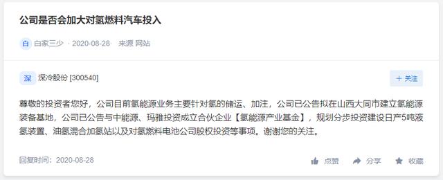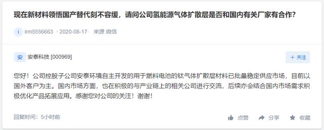 「氢问董秘」是氢云链旗下的全新栏目,主要包含投资者在互动平台上针对氢能、燃料电池等内容方面进行提问和相关企业的回复,每天一期。在这里,你可以全面了解企业的氢能发展动态。 安泰科技问: 现在新材料领悟国产替代刻不容缓,请问公司氢能源气体扩散层是否和国内有关厂家有合作? 安泰科技答: 您好!公司控股子公司安泰环境自主开发的用于燃料电池的钛气体扩散层材料已批量稳定供应市场,目前以国外客户为主。国内市场方面,也在积极的与产业链上的相关公司进行交流,后续亦会结合国内市场需求积极优化产品拓展应用。感谢您对公司的关注!谢谢! 深冷股份问: 公司是否会加大对氢燃料汽车投入 深冷股份答: 尊敬的投资者您好,公司目前氢能源业务主要针对氢的储运、加注,公司已公告拟在山西大同市建立氢能源装备基地,公司已公告与中能源、玛雅投资成立合伙企业【氢能源产业基金】,规划分步投资建设日产5吨液氢装置、油氢混合加氢站以及对氢燃料电池公司股权投资等事项。谢谢您的关注。 四川美丰问: 请问公司开发天然气制氢技术,是出于什么考虑?是不是为氢能源汽车储备技术? 四川美丰答: 您好!目前公司暂未开发天然气制氢技术。谢谢您的关注。 欢迎关注氢云链,获得更多氢能产业资讯。 |