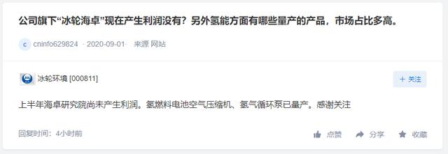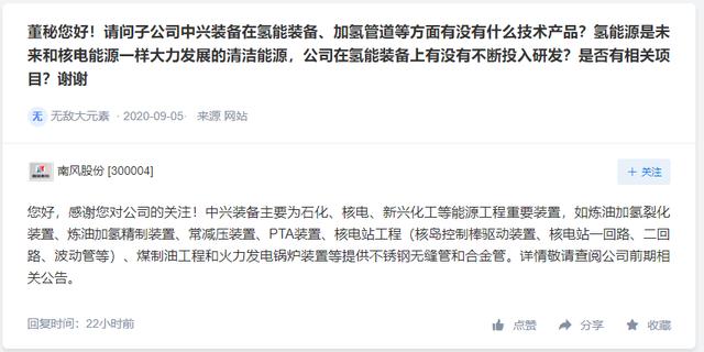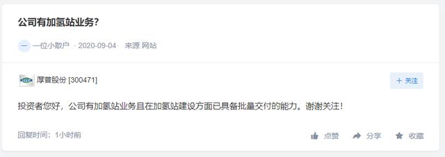 「氢问董秘」是氢云链旗下的全新栏目,主要包含投资者在互动平台上针对氢能、燃料电池等内容方面进行提问和相关企业的回复,每天一期。在这里,你可以全面了解企业的氢能发展动态。 厚普股份问: 公司有加氢站业务? 厚普股份答: 投资者您好,公司有加氢站业务且在加氢站建设方面已具备批量交付的能力。谢谢关注! 冰轮环境问: 公司旗下“冰轮海卓”现在产生利润没有?另外氢能方面有哪些量产的产品,市场占比多高。 冰轮环境答: 上半年海卓研究院尚未产生利润。氢燃料电池空气压缩机、氢气循环泵已量产。感谢关注 南风股份问: 董秘您好!请问子公司中兴装备在氢能装备、加氢管道等方面有没有什么技术产品?氢能源是未来和核电能源一样大力发展的清洁能源,公司在氢能装备上有没有不断投入研发?是否有相关项目?谢谢 南风股份答: 您好,感谢您对公司的关注!中兴装备主要为石化、核电、新兴化工等能源工程重要装置,如炼油加氢裂化装置、炼油加氢精制装置、常减压装置、PTA装置、核电站工程(核岛控制棒驱动装置、核电站一回路、二回路、波动管等)、煤制油工程和火力发电锅炉装置等提供不锈钢无缝管和合金管。详情敬请查阅公司前期相关公告。 欢迎关注氢云链,获得更多氢能产业资讯。 |