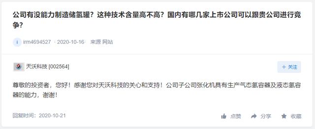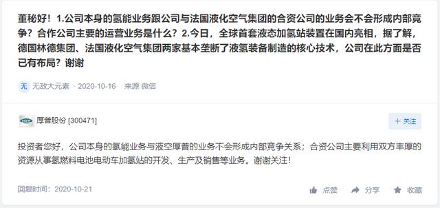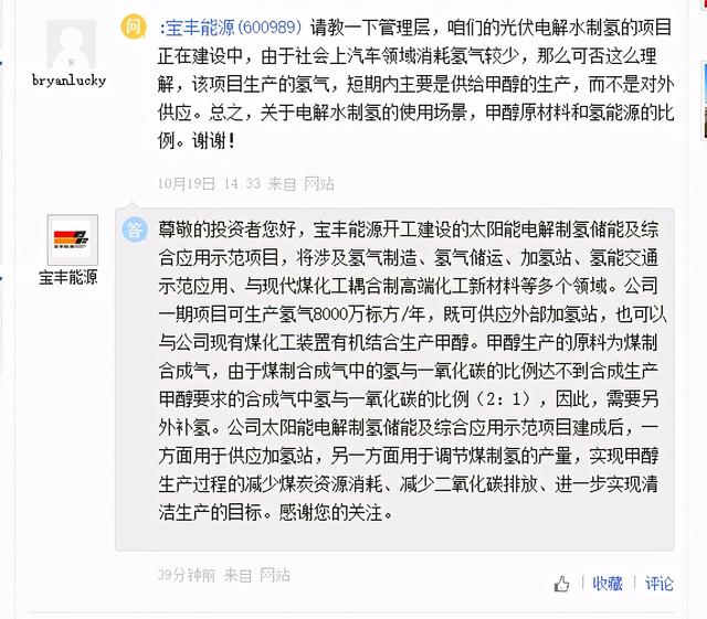 「氢问董秘」是氢云链旗下的全新栏目,主要包含投资者在互动平台上针对氢能、燃料电池等内容方面进行提问和相关企业的回复,每天一期。在这里,你可以全面了解企业的氢能发展动态。 宝丰能源问: 请教一下管理层,咱们的光伏电解水制氢的项目正在建设中,由于社会上汽车领域消耗氢气较少,那么可否这么理解,该项目生产的氢气,短期内主要是供给甲醇的生产,而不是对外供应。总之,关于电解水制氢的使用场景,甲醇原材料和氢能源的比例。谢谢! 宝丰能源答: 尊敬的投资者您好,宝丰能源开工建设的太阳能电解制氢储能及综合应用示范项目,将涉及氢气制造、氢气储运、加氢站、氢能交通示范应用、与现代煤化工耦合制高端化工新材料等多个领域。公司一期项目可生产氢气8000万 厚普股份问: 董秘好!1.公司本身的氢能业务跟公司与法国液化空气集团的合资公司的业务会不会形成内部竞争?合作公司主要的运营业务是什么?2.今日,全球首套液态加氢站装置在国内亮相,据了解,德国林德集团、法国液化空气集团两家基本垄断了液氢装备制造的核心技术,公司在此方面是否已有布局?谢谢 厚普股份答: 投资者您好,公司本身的氢能业务与液空厚普的业务不会形成内部竞争关系;合资公司主要利用双方丰厚的资源从事氢燃料电池电动车加氢站的开发、生产及销售等业务。谢谢关注! 天沃科技问: 公司有没能力制造储氢罐?这种技术含量高不高?国内有哪几家上市公司可以跟贵公司进行竞争? 天沃科技答: 尊敬的投资者,您好!感谢您对天沃科技的关心和支持!公司子公司张化机具有生产气态氢容器及液态氢容器的能力,谢谢! 编辑:氢氢我心 校对:风 免责声明:本文观点不构成投资建议,请谨慎对待 |