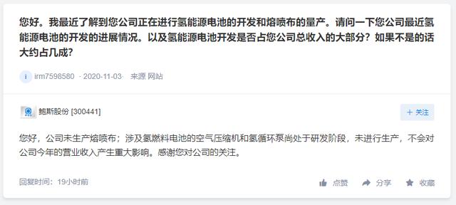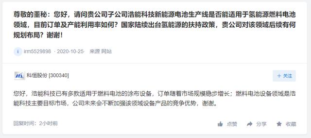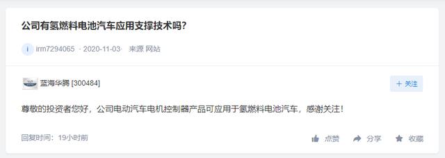 | 「氢问董秘」是氢云链旗下的全新栏目,主要包含投资者在互动平台上针对氢能、燃料电池等内容方面进行提问和相关企业的回复,每天一期。在这里,你可以全面了解企业的氢能发展动态。 科恒股份问: 尊敬的董秘:您好,请问贵公司子公司浩能科技新能源电池生产线是否能适用于氢能源燃料电池领域,目前订单及产能利用率如何?国家陆续出台氢能源的扶持政策,贵公司对该领域后续有何规划布局?谢谢! 科恒股份答: 您好,浩能科技已有多款适用于燃料电池的涂布设备,订单随着市场规模稳步增长;燃料电池设备领域是浩能科技主要目标市场,公司未来会不断加强该领域设备产品的竞争优势,谢谢。 蓝海华腾问: 公司有氢燃料电池汽车应用支撑技术吗? 蓝海华腾答: 尊敬的投资者您好,公司电动汽车电机控制器产品可应用于氢燃料电池汽车,感谢关注! 鲍斯股份问: 您好。我最近了解到您公司正在进行氢能源电池的开发和熔喷布的量产。请问一下您公司最近氢能源电池的开发的进展情况。以及氢能源电池开发是否占您公司总收入的大部分?如果不是的话大约占几成? 鲍斯股份答: 您好,公司未生产熔喷布;涉及氢燃料电池的空气压缩机和氢循环泵尚处于研发阶段,未进行生产,不会对公司今年的营业收入产生重大影响。感谢您对公司的关注。 编辑:氢氢我心 校对:风 免责声明:本文观点不构成投资建议,请谨慎对待 |