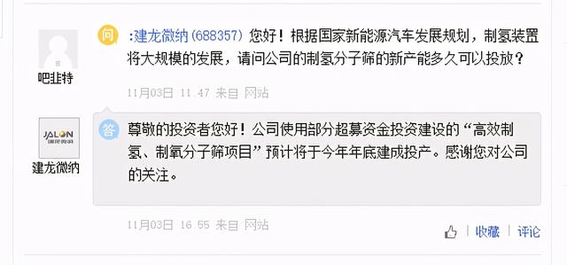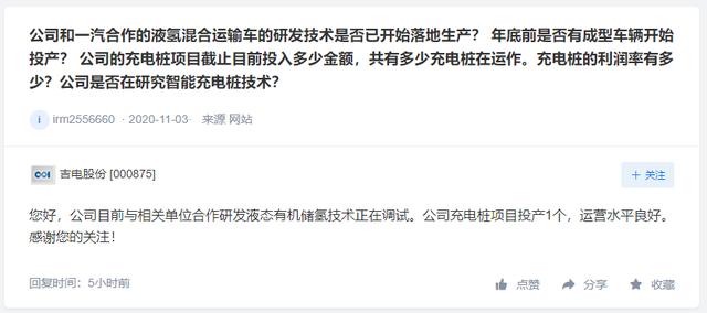| 「氢问董秘」是氢云链旗下的全新栏目,主要包含投资者在互动平台上针对氢能、燃料电池等内容方面进行提问和相关企业的回复,每天一期。在这里,你可以全面了解企业的氢能发展动态。 建龙微纳问: 您好!根据国家新能源汽车发展规划,制氢装置将大规模的发展,请问公司的制氢分子筛的新产能多久可以投放? 建龙微纳答: 尊敬的投资者您好!公司使用部分超募资金投资建设的“高效制氢、制氧分子筛项目”预计将于今年年底建成投产。感谢您对公司的关注。 西藏城投问: 您好,请问公司的三维介孔石墨烯导电剂性能,公司的三维阶孔石墨烯可以储氢不? 西藏城投答: 您好,没有储氢这方面研究。 吉电股份问: 公司和一汽合作的液氢混合运输车的研发技术是否已开始落地生产? 年底前是否有成型车辆开始投产? 公司的充电桩项目截止目前投入多少金额,共有多少充电桩在运作。充电桩的利润率有多少?公司是否在研究智能充电桩技术? 吉电股份答: 您好,公司目前与相关单位合作研发液态有机储氢技术正在调试。公司充电桩项目投产1个,运营水平良好。感谢您的关注! 编辑:氢氢我心 校对:风氢扬 审核:氢云小仙女 免责声明:本文观点不构成投资建议,请谨慎对待 |