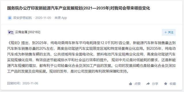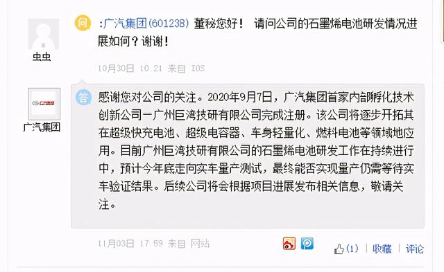 「氢问董秘」是氢云链旗下的全新栏目,主要包含投资者在互动平台上针对氢能、燃料电池等内容方面进行提问和相关企业的回复,每天一期。在这里,你可以全面了解企业的氢能发展动态。 嘉化能源问: 您好,请问贵公司在常熟、张家港两市投资建设的三座示范加氢站开始运营了吗?未来随着燃料电池新能源车的市场规模提速,公司在华东和长三角区域是否会扩大加氢站的网络布局? 嘉化能源答: 感谢关注。目前公司在常熟和张家港各建成一座加氢站;公司在氢能源产业主要布局了氢气提纯、加氢站、液氢等项目,请参考已发布公告和定期报告,未来产业发展思路,已在年报发展与战略章节表述。谢谢。 广汽集团问: 董秘您好! 请问公司的石墨烯电池研发情况进展如何?谢谢! 广汽集团答: 感谢您对公司的关注。2020年9月7日,广汽集团首家内部孵化技术创新公司—广州巨湾技研有限公司完成注册。该公司将逐步开拓其在超级快充电池、超级电容器、车身轻量化、燃料电池等领域 云海金属问: 国务院办公厅印发新能源汽车产业发展规划(2021—2035年)对我司会带来哪些变化 云海金属答: 《规划》提出,到2025年,纯电动乘用车新车平均电耗降至12.0千瓦时/百公里,新能源汽车新车销售量达到汽车新车销售总量的20%左右,高度自动驾驶汽车实现限定区域和特定场景商业化应用。到2035年,纯电动汽车成为新销售车辆的主流,公共领域用车全面电动化,燃料电池汽车实现商业化应用,高度自动驾驶汽车实现规模化应用,有效促进节能减排水平和社会运行效率的提升。 规划中无论是对低能耗的要求,还是新能源汽车规模的增加,都 编辑:氢氢我心 校对:风 免责声明:本文观点不构成投资建议,请谨慎对待 |