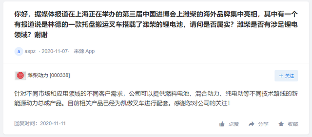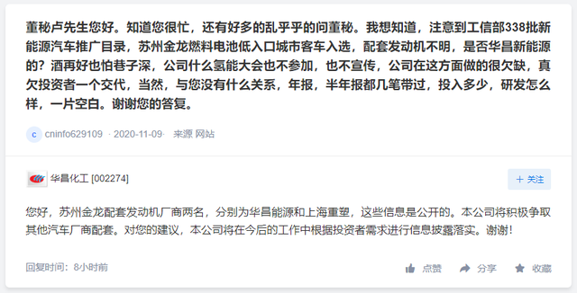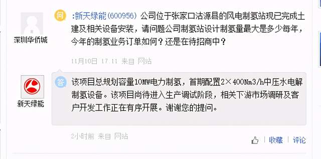 「氢问董秘」是氢云链旗下 新天绿能问: 公司位于张家口沽源县的风电制氢站现已完成土建及相关设备安装,请问题公司制氢站设计制氢量最大是多少每年,今年的制氢业务订单如何?还是在待招商中? 新天绿能答: 该项目总规划容量10MW电力制氢,首期配置2×400Nm3/h中压水电解制氢设备。该项目尚待进入生产调试阶段,相关下游市场调研及客户开发工作正在有序开展。谢谢您的提问。 潍柴动力问: 你好,据媒体报道在上海正在举办的第三届中国进博会上潍柴的海外品牌集中亮相,其中有一个有报道说是林德的一款托盘搬运叉车搭载了潍柴的锂电池,请问是否属实?潍柴是否有涉足锂电领域?谢谢 潍柴动力答: 针对不同市场和应用领域的不同客户需求,公司可以提供燃料电池、混合动力、纯电动等不同技术路线的新能源动力总成产品。目前相关产品已经为凯傲叉车进行配套。感谢您对公司的关注! 华昌化工问: 董秘卢先生您好。知道您很忙,还有好多的乱乎乎的问董秘。我想知道,注意到工信部338批新能源汽车推广目录,苏州金龙燃料电池低入口城市客车入选,配套发动机不明,是否华昌新能源的?酒再好也怕巷子深,公司什么氢能大会也不参加,也不宣传,公司在这方面 华昌化工答: 您好,苏州金龙配套发动机厂商两名,分别为华昌能源和上海重塑,这些信息是公开的。本公司将积极争取其他汽车厂商配套。对您的建议,本公司将在今后的工作中根据投资者需求进行信息披露落实。谢谢! 编辑:氢氢我心 校对:风 免责声明:本文观点不构成投资建议,请谨慎对待 |