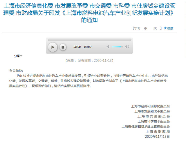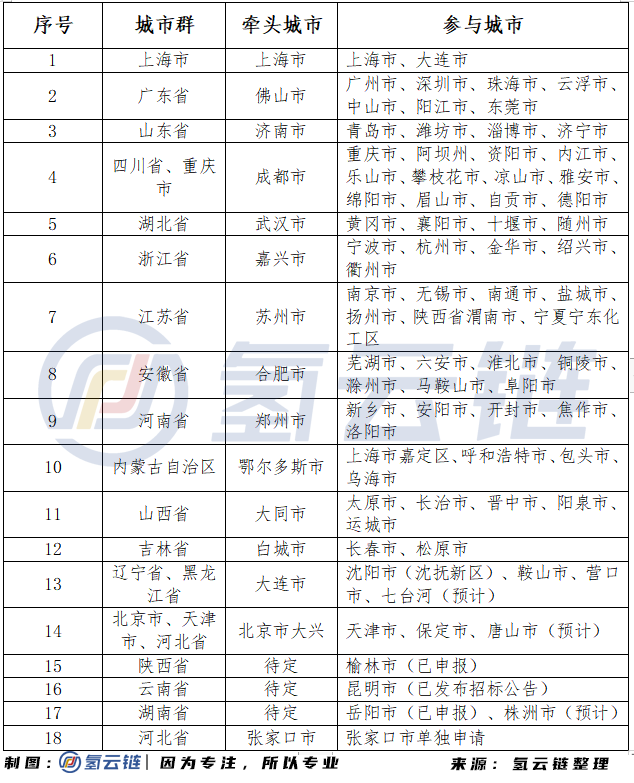 Hello,氢云链「氢云周报」全面上线啦! 「氢云周报」是氢云链旗下的全新栏目,包含政策、行业投资、市场行情等板块,每周一期,为大家整理国内外氢能源及燃料电池产业的最新行业动态。在这里,你可以全面了解各国氢能政策与风向,掌握各地与企业的氢能发展动态。 接下来为您奉上2020年11月8日-11月14日「氢云周报」。 1、广东、上海发布氢能汽车产业最新政策11与12日,氢云链从广东省发改委官网获悉,《广东省加快氢燃料电池汽车产业发展实施方案》正式印发。 图1 《广东省加快氢燃料电池汽车产业发展实施方案》 《实施方案》中指出,要着力培育氢燃料电池汽车产业链,支持氢燃料电池技术研发创新,开展氢燃料电池汽车规模化推广应用,加快推进加氢站规划建设和多渠道增加氢源供应等六方面做出了具体要求。 值得注意的是,在加氢站建设方面,鼓励市区根据实际情况对加氢基础设施建设给予补贴,各级财政补贴合计不超过500万元/站,且不超过加氢站固定资产投资50%,超过部分省级财政补贴作相应扣减。而且方案中还指出要适时在广州、深圳、深汕特别合作区等地试点开展氢燃料电池乘用车示范运行,力争2022年实现首批氢燃料电池乘用车示范运行。 11月13日,据上海市经济信息化委官网,为加快推进上海市燃料电池汽车产业高质量发展,引领产业转型升级,打造世界级汽车产业中心,上海市经济信息化委、发展改革委、交通委、科委、住房城乡建设管理委、财政局联合制定了《上海市燃料电池汽车产业创新发展实施计划》。 图2 《上海市燃料电池汽车产业创新发展实施计划》 根据《实施计划》,到2023年,上海燃料电池汽车产业发展实现“百站、千亿、万辆”总体目标,规划加氢站接近100座并建成运行超过30座,加氢网络全国最大,形成产出规模约1000亿元,发展规模全国前列,推广燃料电池汽车接近10000辆,应用规模全国领先;燃料电池汽车产业整体发展水平达到国际领先,关键技术实现自主掌握。 2、近20省市燃料电池汽车示范城市群最新动态根据文件要求,申报的截止日期是11月15日(周日),但今天(11月14日)是截止日前最后一天,氢云链对各地申报情况再次进行了整理,具体见表1。 表1 各省市示范城市群申报工作进展情况 从申报情况来看,自9月16日五部委下发《关于开展燃料电池汽车示范应用的通知》以来,城市群申报热度持续上升,大陆31省市自治区中有申报城市群的地区已超过半数,各省市参与的城市也越来越多,显示出对燃料电池汽车发展极大的热情。需要指出的是,很多地区此前并没有发展燃料电池汽车产业,资源条件、工业基础也并不突出,有一定“凑热闹”的“嫌疑”。 值得注意的是,之前一直单独申报的上海市,也在不久之前与大连市签署联合申报燃料电池汽车示范城市的合作协议,而就在昨天,河北省张家口市也提出了退出北京市、天津市和河北省的联合申报城市群,打算自己单独申请。 3、山东省新基建三年行动方案发布,将建设30座加氢站近日,山东省新基建三年行动方案正式发布,方案指出山东2022年基本建成新型基础设施建设先行区示范区,而在加氢站方面,指出要合理配置、适度超前布局加氢站,强化高速公路服务区、公路加油站等重点交通区域的配套建设。到2022年,全省各类充电桩保有量达10万个以上、加氢站30座,依托具备条件的高速服务区基本建成充电站间距合理的服务圈。 4、空气产品公司计划在华设立氢能应用研发中心近日,空气产品公司在进博会上与浙江嘉兴海盐经济技术开发区签署合作备忘录,共同探索在氢能应用研发领域的合作,同时在当地设立氢能应用研发中心。空气产品公司称,双方意向开展的氢能应用研发方向覆盖从氢气生产到终端应用中的各项关键技术,主要包括新型高效储氢运氢、燃料电池关键材料和核心部件的设计开发,以及氢能燃料电池检测相关装备研发和产业化。 5、鸿达兴业与乌海公交公司签署供氢协议近日,鸿达兴业发布公告,日前,公司全资子公司内蒙古乌海化工有限公司(简称“乌海化工”)与乌海市公共交通有限责任公司(简称“乌海公交公司”)签署《燃料电池汽车供氢服务协议》,乌海化工为乌海公交公司运行的燃料电池公交、大巴等用氢车辆提供氢气及加注服务,充分利用双方的资源和优势,共同致力于在乌海市开展氢能车推广及示范应用,推动乌海市氢能城市建设,共同助力氢能社会发展。 6、华能、西门子布局广西海上风电,开发氢能领域近日,钦州市政府与中国华能集团公司、西门子能源有限公司在南宁签署华能西门子广西北部湾海上风电产业大基地化开发项目合作框架协议。据悉,华能西门子广西北部湾海上风电产业大基地化开发项目包括北部湾风电总装基地、部分海上风电资源开发及延伸产业项目三部分。项目总投资约1100亿元,设计年产值约300亿元。此次三方合作时机好、效率高,西门子能源有十足的信心和决心,共同推动项目建设,在氢能源开发等方面进一步加强合作,结出更多丰硕的合作成果。 7、康明斯与Navistar合作研发8级氢燃料卡车近日,据外媒报道,全球动力领导者康明斯宣布与Navistar International Corporation。公司合作,联手研发由氢燃料电池驱动的8级卡车。据悉,该项目的部分资金将由美国能源部(DOE)能源效率与可再生资源(EERE)办公室于8月宣布的一项奖励提供。此外,