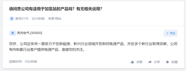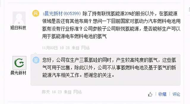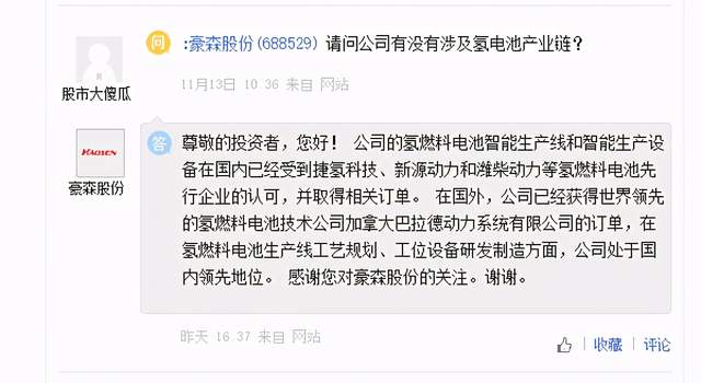 「氢问董秘」是氢云链旗下的全新栏目,主要包含投资者在互动平台上针对氢能、燃料电池等内容方面进行提问和相关企业的回复,每天一期。在这里,你可以全面了解企业的氢能发展动态。 豪森股份问: 请问公司有没有涉及氢电池产业链? 豪森股份答: 尊敬的投资者,您好! 公司的氢燃料电池智能生产线和智能生产设备在国内已经受到捷氢科技、新源动力和潍柴动力等氢燃料电池先行企业的认可,并取得相关订单。 在国外,公司已经获得世界领先的氢燃料电池技术公司加拿大巴拉德动力系统有限公司的订单,在氢燃料电池生产线工艺规划、工位设备研发制造方面,公司处于国内领先地位。 感谢您对豪森股份的关注。谢谢。 晨光新材问: 除了持有联悦氢能源20%的股份以外,在氢能源领域是否还有其他布局?想问一下目前国家对氢动力汽车燃料电池用氢有没有行业标准?公司参股子公司联悦氢能源,是否能够生产可以用于氢能源电车燃料电池的氢气 晨光新材答: 您好,公司在生产三氯氢硅的同时,产生较高纯度的氢气,这些氢气可用于出售,除此以外,公司不从事氢燃料电池及基于氢气的新能源汽车相关工作。感谢您的关注。 英杰电气问: 请问贵公司有适用于加氢站的产品吗?有无相关运用? 英杰电气答: 您好,公司近年来一直致力于在新能源、新兴行业领域开发新的电源产品,并在多个新行业取得突破,公司有向制氢行业客户提供电源产品,谢谢您的关注。 编辑:氢氢我心 校对:风 免责声明:本文观点不构成投资建议,请谨慎对待 |