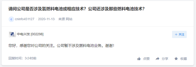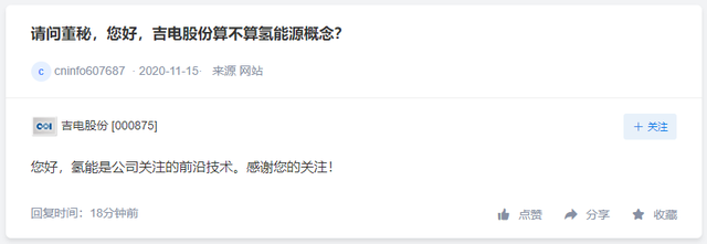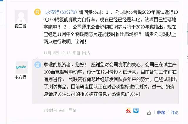 「氢问董秘」是氢云链旗下的全新栏目,主要包含投资者在互动平台上针对氢能、燃料电池等内容方面进行提问和相关企业的回复,每天一期。在这里,你可以全面了解企业的氢能发展动态。 永安行问: 请问贵公司: 1 . 公司原公告说2020年底试运行100_500辆氢能源助力自行车,现在已经已经是年底,该项目已经落地实施嘛? 2 . 公司原来公告说物联网芯片将于2020年底推出,现在已经是11月 永安行答: 尊敬的投资者,您好! 感谢您对公司发展的关心,公司已在试生产100台氢燃料电动车,预计在12月份投入试运营,目前各项工作正在有序进行。 物联网存储芯片经研发团队多年来的努力,已经试制出了测试样品,目前研发团队正在对各项指标进行测试,进一步的消息请您关注公司的相关披露信息。感谢您的关注! 吉电股份问: 请问董秘,您好,吉电股份算不算氢能源概念? 吉电股份答: 您好,氢能是公司关注的前沿技术。感谢您的关注! 中电兴发问: 请问公司是否涉及氢燃料电池或相应技术?公司还涉及 中电兴发答: 您好,感谢您对公司的关注。公司暂不涉及燃料电池业务。谢谢! 编辑:氢氢我心 校对:风 免责声明:本文观点不构成投资建议,请谨慎对待 |