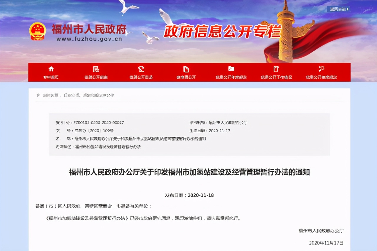 | 近日,氢云链从福州市人民政府官网获悉,福州市办公厅正式印发关于福州市加氢站建设及经营管理暂行办法的通知,加快推进福州市加氢站建设工作,规范加氢站建设与管理。全文如下: 福州市加氢站建设及经营管理暂行办法 第一条 为加快推进福州市加氢站建设工作,规范加氢站建设与管理,根据相关法律法规和技术标准,结合我市实际情况,制定本办法。 第二条 本办法适用于本市行政区域内加氢站规划、建设、经营和安全管理工作。 第三条 市、县(市)区人民政府应急管理、自然资源和规划、建设、市场监管等部门,依据下列职责共同做好加氢站管理工作: (一)应急管理部门负责会同自然资源和规划部门编制加氢站专项规划,负责加氢站的安全监督管理,办理危险化学品相关安全许可; (二)自然资源和规划部门负责将加氢站布点专项规划纳入国土空间规划,办理规划用地审批; (三)建设部门负责加氢站建筑工程建设监督管理; (四)市场监督管理部门负责气瓶充装监督管理; (五)发改、工信、气象、人防、交通、消防、生态环境等部门在各自职责范围内,依法做好加氢站管理的相关工作。 第四条 加氢站建设用地应符合有关规划,且应依法通过招标、拍卖、挂牌方式出让取得。 加氢站布点规划未出台前的单个项目,由所在县(市)区应急管理部门召集自然资源和规划、建设、工信、交通、生态环境、人防、气象等部门对用地进行联合勘察,按上述规定进行审查。 第五条 加氢站、加氢合建站建设(含新建、改建、扩建)包括加氢站、加氢合建站布点规划,加氢站、加氢合建站选址、设计、施工、运行及安全管理应符合《加氢站技术规范》(GB 50516-2010)、《加氢站安全技术规范》(GB/T 34584-2017)、《氢能车辆加氢设施安全运行管理规程》(GB/Z 34541-2017)、《移动式加氢设施安全技术规范》(GB/T 31139-2014)、《加氢站用储氢装置安全技术要求》(GB/Z 34583-2017)以及将实施的《汽车加油加气加氢站技术标准》(GB50156)等有关标准规定。 第六条 加氢站设计、施工、监理单位必须具备相应资质,由建设部门组织审查加氢站项目设计、施工方案,审查意见可作为工程建设许可的依据。 第七条 应急管理部门负责组织加氢站建设项目的安全审查工作,包括安全条件审查、安全设施设计审查等,建设单位依法应自行组织加氢站建设项目安全设施竣工验收。 第八条 福州市加氢站建设项目按社会投资项目实施审批,具体审批事项和流程由市应急管理部门会同其他部门另行制定,并公布实施。 第九条 加氢站建设项目未经验收或验收不合格的,不得交付使用。 第十条 加氢站建设项目验收通过后,加氢站经营主体应当分别向市市场监督管理部门和市应急管理部门申请核发《气瓶充装许可证》《危险化学品经营许可证》,方可开展经营活动。 第十一条 加氢站供应的汽车用氢气应当符合相关技术标准。氢气价格应标示在加氢机及其他显著位置。氢气的计量设备应当定期进行检定。 第十二条 加氢站经营主体应当对从业人员进行必要的安全生产知识教育培训,使从业人员熟悉有关的安全生产规章制度和安全操作规程,掌握本岗位的安全操作技能。加氢站经营主体管理人、技术负责人、设备管理及操作人员等需到相应的专业培训机构进行专业技术培训,并取得相关部门颁发的上岗证书。 第十三条 加氢站经营主体必须建立健全安全管理制度、安全生产责任制度、风险管理体系,制定事故应急预案,并定期组织应急演练。至少每半年组织一次生产安全事故应急救援预案演练。 加氢站安全管理制度、安全操作规范应当张贴在醒目位置。发现加氢站存在事故安全隐患的,应当及时采取措施消除。 加氢站安全管理制度应当设有安全运行管理机构及各级安全责任人,经营主体主要负责人为单位安全责任人,负责组织制订实施本单位安全生产规章制度和安全操作规程,对本单位的安全事故负主要责任。 加氢站安全管理制度应当包括但不限于以下内容: (一)运行现场安全管理制度; (二)消防安全管理制度; (三)设备安全管理制度; (四)工作人员安全管理制度; (五)安全检查管理制度; (六)事故上报处理流程; (七)定期检验制度; (八)安全保卫工作管理制度; (九)危险化学品安全管理制度。 第十四条 加氢站经营主体应当规范其运行信息的记录,对运行、维护、检验、监控、故障事故及人员资质等数据进行实时记录并定期保存。 第十五条 加氢站主要设备应标示清晰的安全工艺流程图,在主要操作点上标示相关安全负责人的姓名和联系方式等信息,在危险区域及重要设备处悬挂相应安全警告标志。 第十六条 有下列情形之一的,加氢站不得为用氢车辆加氢: (一)以氢气为燃料的汽车无出厂检验合格证; (二)汽车氢气瓶超过检验期限、定期检验不合格或者报废的; (三)未取得市场监督管理部门核发的车用气瓶使用登记证。 第十七条 加氢站人员应当对氢气配送车辆的相关手续进行查验。对无有效合格证、手续不全 第十八条 加氢站只能通过加氢机向汽车储氢瓶加氢,禁止向其他容器加氢,禁止在站外加氢。 第十九条 任何单位和个人不得侵占、损毁、擅自拆除加氢站设施,不得损毁、覆盖、涂改、擅自拆除或移动加氢站的安全警示标志。 任何单位和个人发现有危害加氢站及其安全警示标志的行为,有权予以劝阻