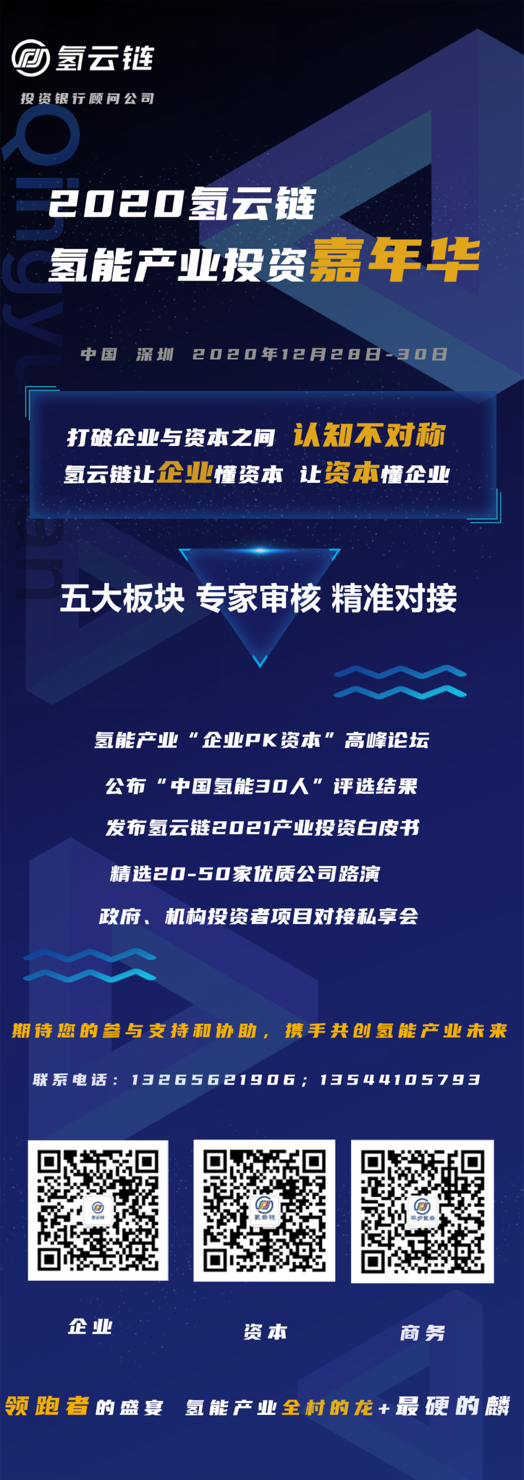2020年新冠疫情肆虐全球,全球市场面临能源革命百年未有大变局,抢占“氢经济、氢科技、氢产业”的主导权正在成为欧美日韩的国家博弈要点。中国作为全球氢燃料电池汽车最大市场属于兵家必争之地,氢云链认为,在市场开放、外企涌入、国内核心零部件技术逐渐突破的情况下,政策和资金是影响当下产业发展的两个主要瓶颈。“以奖代补”示范政策覆盖面小,政府需要借助市场“聪明”资本助力产业规模化发展。 如图1所示,氢云链认为 “企业不懂资本、资本不懂企业”是导致国内企业融资难、机构投资难、政府招商难和科研成果转化难的原因之一。如何实现“企业懂资本、资本懂企业”,加强企业与资本的沟通且提高市场资源配置效率变得越来越重要。 图1 国内氢能产业化面临的四个行业痛点 为打破企业和资本认知不对称,实现“企业懂资本、资本懂企业”目标,氢云链作为国内领先的专注氢能领域的投研平台,拟于2020年12月28日、29日、30日在深圳为投资者、资本、政府和企业带来精心打造[氢云链:2020•氢能产业投资嘉年华]。 为配合本次嘉年华活动,氢云链携手行业协会和权威科研机构联合发起“中国氢能30人”评选活动,通过甄选中国氢能企业家中的长跑冠军、隐形冠军和对中国氢能产业发展做出了杰出贡献的领军人物,目标是树立行业榜样和标杆,弘扬产业奋斗精神,激发产业发展热情,探讨中国氢能产业在未来全球竞争中崛起之路。 嘉年华会议将邀请最具前沿思想力的业内专家、资本大咖、实业界翘楚和100家知名投资机构,全方位、多角度对全球氢能和燃料电池的产业逻辑、投资方法、上市融资、企业估值、发展战略、并购重组等市场热点话题展开深入交流,共同探讨未来十年全球氢能产业投资方向和机会。嘉年华会议将公布“中国氢能30人”评选结果,提供数十家精选优质项目对接、企业新产品发布、基金发行等特色内容。 在本次为期3天的投资嘉年华盛会中,我们将举办如下活动: 氢能产业“企业PK资本”高峰论坛 发布氢云链2021产业投资白皮书 公布“中国氢能30人”评选结果 精选20-50家优质公司路演 机构投资者项目对接私享会 我们将发挥平台专业资源聚集优势,携手资本和企业为您带来一场场精彩纷呈的产业、资本和思想的盛宴! 大会议程介绍(拟定)