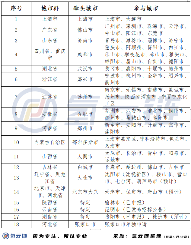 「氢云周报」是氢云链旗下的全新栏目,包含政策、行业投资、市场行情等板块,每周一期,为大家整理国内外氢能源及燃料电池产业的最新行业动态。在这里,你可以全面了解各国氢能政策与风向,掌握各地与企业的氢能发展动态。 接下来为您奉上2020年11月15日-11月21日「氢云周报」。 燃料电池汽车示范申报截止,京沪广入选机会较大 11月15日是申报氢燃料电池汽车示范城市群截止日。氢云链从相关信息指出,已有超20余个城市群最终递交了申报材料。上海证券报分析指出,从申报情况来看,目前京、沪、广入选优势较大,而最终入选燃料电池汽车示范城市的结果,预计将在年内公布最终申报结果。 上海轻程签约160辆氢能重卡 2020年11月13日,北汽福田、上海轻程正式签约100台智蓝氢燃料重卡,这标志着福田汽车继今年9月份发布氢燃料汽车发展战略后,在氢能战略落地上迈出愈加坚实的一步。据悉,该批智蓝氢燃料重卡将于明年2月底陆续交付运营。 2020年11与16日,华菱星马携手上海轻程、重塑科技氢燃料重卡合作签约仪式”在杭州顺利举行,60台氢燃料电池重卡成功签约,这标志着华菱星马在新能源重卡发展上开启了一个新的阶段。 据悉,此次签约的智蓝氢燃料重卡,将采用“燃料电池+动力电池”双动力驱动组合,搭载上海重塑科技股份有限公司生产的镜星系列燃料电池系统,匹配宁德时代高功率动力电池,以及大容积高压储氢系统,一次加氢续驶里程超过500公里。而华菱星马氢燃料重卡虽然未公布动力配置及参数,但大概率也会采用智蓝氢燃料重卡一样燃料电池系统。 值得注意的是,在近两个月时间内,已有近300辆氢能重卡签约,氢能重卡市场热情高涨。可以说中国氢能重卡规模化运营时代即将来临。 《低碳氢、清洁氢与可再生能源氢气标准及认定》团标征求意见