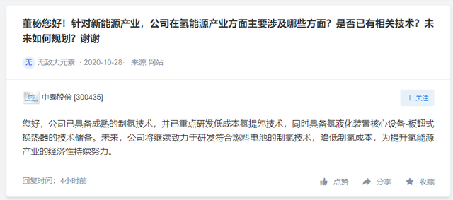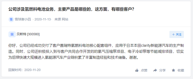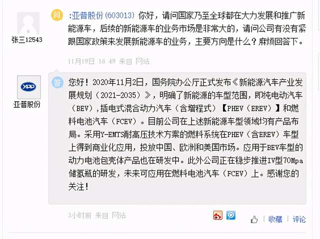 「氢问董秘」是氢云链旗下的全新栏目,主要包含投资者在互动平台上针对氢能、燃料电池等内容方面进行提问和相关企业的回复,每天一期。在这里,你可以全面了解企业的氢能发展动态。 亚普股份问: 你好,请问国家乃至全球都在大力发展和推广新能源车,后续的新能源车的业务市场是非常大的,请问公司有没有紧跟国家政策来发展新能源车的业务,主要方向是什么?麻烦回答下。 亚普股份答: 您好!2020年11月2日,国务院办公厅正式发布《新能源汽车产业发展规划(2021-2035)》,明确了新能源的车型范围,即纯电动汽车(BEV),插电式混合动力汽车(含增程式)【PHEV(EREV)】和燃料电池汽车(FCEV)。目前公司在上述新能源车型领域均有产品布局。采用Y-EMTS耐高压技术方案的燃料系统在PHEV(含EREV)车型上得到商业化应用,投放中国、欧洲和美国市场。应用于BEV车型的动力电池包壳体产品也在研发中。此外公司正在稳步推进IV型70Mpa储氢瓶的研发,未来可应用在燃料电池汽车(FCEV)上。感谢您的关注! 贝斯特问: 公司涉及氢燃料电池业务,主要产品是哪些的,这方面,有哪些客户? 贝斯特答: 你好,公司已经成功交付了客户盖瑞特氢燃料电池核心配套组件,应用于日本本田clarity新能源汽车的生产制造。同时,公司还积极投入到与客户共同合作开发的的氢气压缩泵项目、电子冷却泵等节能减排项目,切实为后续快速大规模进入氢能源汽车产业链积累了丰富制造经验和技术储备。谢谢。 中泰股份问: 董秘您好!针对新能源产业,公司在氢能源产业方面主要涉及哪些方面?是否已有相关技术?未来如何规划?谢谢 中泰股份答: 您好,公司已具备成熟的制氢技术,并已重点研发低成本氢提纯技术,同时具备氢液化装置核心设备-板翅式换热器的技术储备。未来,公司将继续致力于研发符合燃料电池的制氢技术,降低制氢成本,为提升氢能源产业的经济性持续努力。 金卡智能答: 尊敬的投资者您好,感谢您对公司的关注。公司现有智能终端产品可用于氢能源等气体计量。 编辑:氢氢我心 校对:风氢扬 审核:氢云小仙女 免责声明:本文观点不构成投资建议,请谨慎对待 |