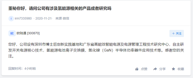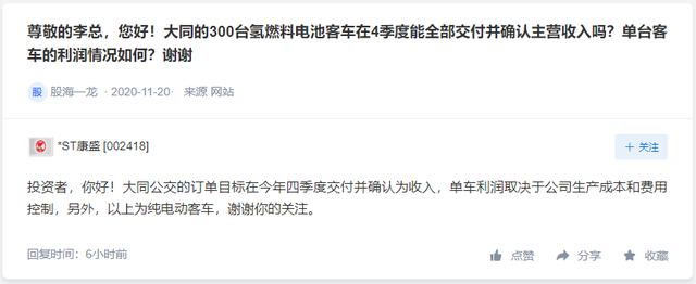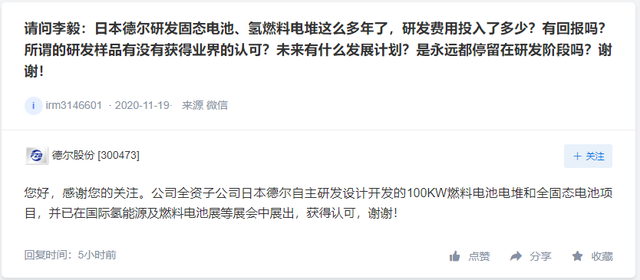 「氢问董秘」是氢云链旗下的全新栏目,主要包含投资者在互动平台上针对氢能、燃料电池等内容方面进行提问和相关企业的回复,每天一期。在这里,你可以全面了解企业的氢能发展动态。 欧陆通问: 董秘你好,请问公司有涉及氢能源相关的产品或者研究吗 欧陆通答: 您好,公司设有深圳市博士后创新实践基地和广东省高能效智能电源及电源管理工程技术研究中心,自主研发开关电源核心技术,氢能源电池离子交换膜、氮化镓(GaN)半导体功率器件应用技术等。感谢您的关注。 德尔股份问: 请问李毅:日本德尔研发固态电池、氢燃料电堆这么多年了,研发费用投入了多少?有回报吗?所谓的研发样品有没有获得业界的认可?未来有什么发展计划?是永远都停留在研发阶段吗?谢谢! 德尔股份答: 您好,感谢您的关注。公司全资子公司日本德尔自主研发设计开发的100KW燃料电池电堆和全固态电池项目,并已在国际氢能源及燃料电池展等展会中展出,获得认可,谢谢! *ST康盛问: 尊敬的李总,您好!大同的300台氢燃料电池客车在4季度能全部交付并确认主营收入吗?单台客车的利润情况如何?谢谢 *ST康盛答: 投资者,你好!大同公交的订单目标在今年四季度交付并确认为收入,单车利润取决于公司生产成本和费用控制,另外,以上为纯电动客车,谢谢你的关注。 编辑:氢氢我心 校对:风氢扬 审核:氢云小仙女 免责声明:本文观点不构成投资建议,请谨慎对待 |