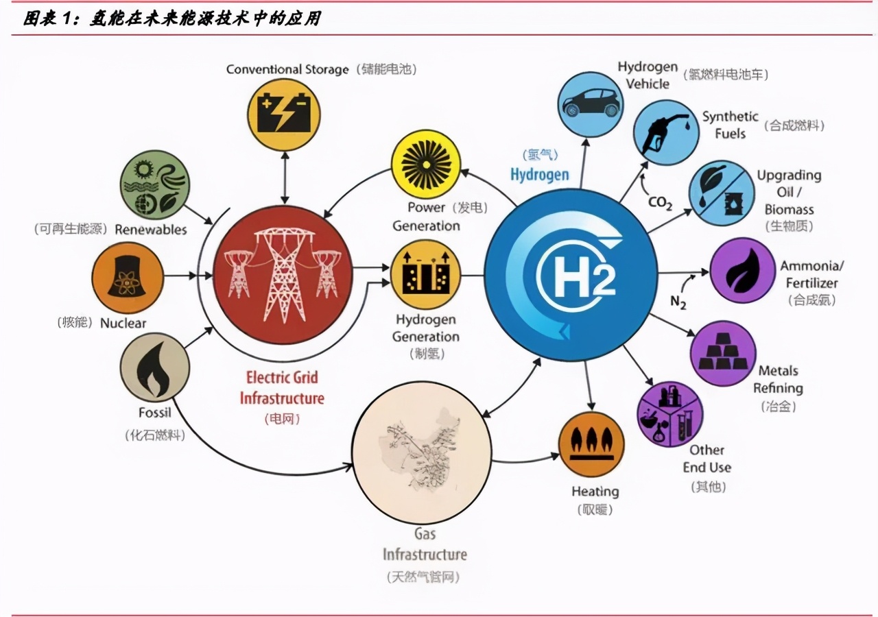 1、 “氢能时代”大幕拉开 1.1 氢能是第三次能源变革的重要媒介 全球能源行业正经历着以低碳化、无碳化、低污染为方向的第三次能源变革,随 着全球能源需求不断增加,全球电气化趋势明显,未来以可再生能源增长幅度最大的 电力能源结构将持续变化,进一步形成以石油、天然气、煤炭、可再生能源为主的多 元化能源结构。 氢能作为一种清洁、高效、安全、可持续的二次能源,可通过一次能源、二次能 源及工业领域等多种途径获取,氢能将成为第三次能源变革的重要媒介。氢能可以用 于交通运输,作为石油精炼、氨生产的原料,以及金属精炼和住宅部门的加热和烹饪 等方方面面。而且,氢气有潜力成为整合不同基础设施的能源载体,以提高经济效率、 可靠性、灵活性,而且其中许多用途将有助于减少电力和交通部门的碳排放。氢还可 以为电力部门提供大规模的长期能量存储。此外,氢能源存储系统可以提供辅助电网 服务,如应急、负荷跟踪和调节储备,这些服务可以提供额外的能量来源,从而降低 电解制氢的成本。氢还可以成为 VRE 和交通部门之间的另一座桥梁。