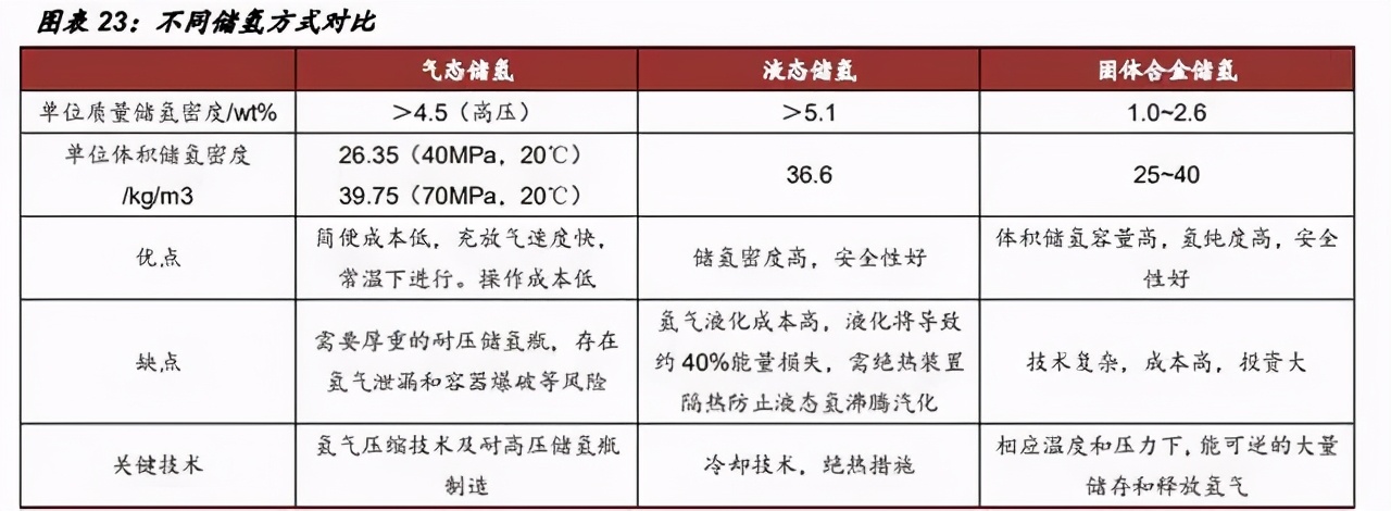 相比通过大规模的输电设施建设来分配可再生能源电力,将可再生能源电力就地 制氢,再通过管道和公路等方式储存和运输,就近消纳,应该是更贴近市场需求和解 决可再生能源消纳的措施。 3.2 储运氢:氢气的储存和运输效率亟待提高 氢气的可大规模存储和运输是其区别于化学电池储能的重要特性,在资源总量不 受约束,制备成本中远期可控的前提下,氢气的储存性能和运输效率是氢能网络建设 的瓶颈问题。 储氢技术 目前,氢气的储存主要有气态储氢、液态储氢和固体储氢三种方式、高压气态储 氢已得到广泛应用,低温液态储氢在航天等领域得到应用,有机液态储氢和固态储氢 尚处于示范阶段。 气态储氢。高压气态储氢具有充放氢气速度快、容器结构简单等优点,是现阶段 主要的储氢方式,氛围高压氢瓶和高压容器两大类。其中钢制氢瓶和钢制压力容器技 术最为成熟,成本较低。20MPa 钢制氢瓶已得到广泛的工业应用,并于 45MPa 钢制 氢瓶、98MPa 钢带缠绕式压力容器组合应用于加氢站中。碳纤维缠绕高压氢瓶的开 发应用,实现了高压气态储氢瓶由固定式应用向车载储氢应用的转变。70MPa 碳纤 维缠绕 4 型瓶已经是国外燃料电池乘用车车载储氢的主流技术,35MPa 碳纤维缠绕 3 型瓶目前仍是我国燃料电池商用车的车载储氢方式,70MPa 碳纤维缠绕 3 型瓶已 少量用于我国燃料电池乘用车中。 液态储氢。液态储氢具有储氢密度高等优势,可分为低温液态储氢和有机液体储 氢。低温液态储氢将氢气冷却至-253℃,液化储存于低温绝热液氢罐中,储氢密度可 达 70.6kg/m3,但装置一次性投资较大,液化过程中能耗较高,储存过程中有一 定 的蒸发损失,其蒸发率与处请关注容积有关,大储罐的蒸发率远低于小储罐。国内产 能液氢已在航天工程中成功使用,民用缺乏相关标准。 有机液体储氢利用某些不饱和有机物(如烯烃、炔烃或芳香烃)与氢气进行可逆 加氢和脱氢反应,实现氢的储存,加氢后形成的液体有机氢化物性能稳定,安全性高, 储存方式与石油产品相似。但存在着反应温度较高、脱氢效率较低、催 化剂易被中 间产物毒化等问题。国内已有燃料电池客车车载储氢示范应用案例。 固体储氢。固态储氢是以金属氢化物、化学氢化物或纳米材料等作为储氢载体, 通过化学吸附和物理吸附的方式实现氢的存储。固态储氢具有储氢密度高、储氢压力低、安全性好、放氢纯度高等优势,其体积储氢密度高于液氢。但主流金属储氢材料 质量储氢率仍低于 3.8wt%,质量储氢率大于 7wt%的轻质储氢材料还需解决吸放氢 温度偏高、循环性能较差的问题、国外固态储氢已在燃料电池潜艇中商业应用,在分 布式发电和风电制氢规模储氢中得到示范应用:国内固态储氢已在分布式发电中得到 示范应用。