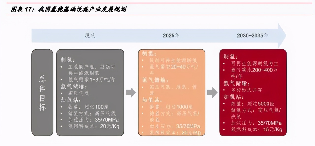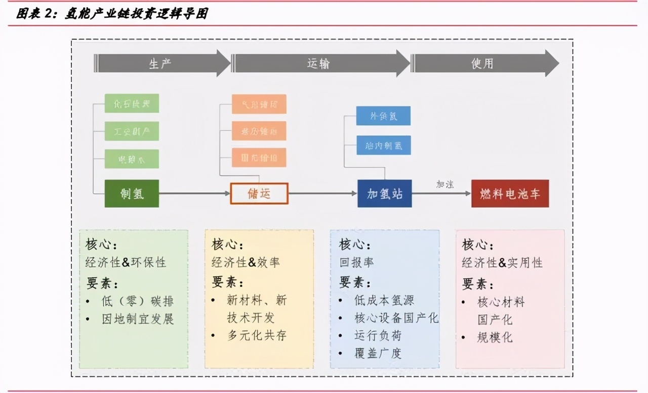 1.2 投资总结:“政策扶持”&“技术进步”双引擎驱动氢能产业发展 2019 年氢能源首次写入《政府工作报告》,将氢能纳入中国能源体系之中,我国 真正开启氢能大发展元年,按照白皮书路线规划,预计到 2050 年氢能在中国能源体 系中的占比约为 10%,氢气需求量接近 6000 万吨,年经济产值超过 10 万亿元,全 国加氢站达到 10000 座以上,燃料电池汽车年产量达到 520 万辆。 氢能产业链分为制氢、储运、加氢站、氢燃料电池应用等多个环节。与锂电池产 业链相比,氢能源与燃料电池产业链更长,复杂度更高,理论经济价值含量更大。从 氢能实际应用来看,氢燃料电池汽车是氢能高效利用的最有效途径,当前氢能产业链 已初具雏形,且燃料电池系统性能已满足商业化需求,但燃料电池汽车的大规模商业 化应用依然受经济性及实用性制约。因此,产业发展初期的政策扶持显得尤为重要, 政策扶持下产业进入规模化-降本-开拓市场的良性内循环,此外,持续的技术进步也 将反哺解决各环节核心技术的成本制约,进一步提升商业化竞争力。 从经济性及技术进步角度来看,各环节都将分阶段发展满足商业化需求: 制氢产业:短期优先选用工业副产氢,中期采用化石能源制氢结合碳捕捉技术, 长期采用可再生能源电解水制氢; 氢能储运:将按照“低压到高压”“气态到多相态”的技术发展方向,逐步提升氢气 的储存和运输能力; 燃料电池系统:将持续围绕功率、性能、寿命、成本四大要素而发展。具体应用 集中在交通领域,从商用车切入、乘用车跟进。