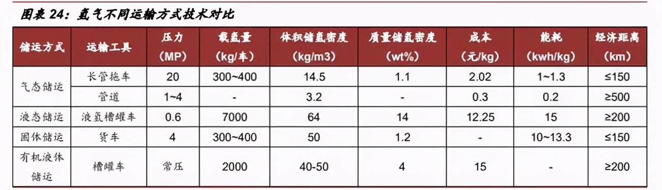 氢输运技术 氢气在常温常压下为气态,密度仅为 0.0899 千克/立方米。作为易燃气体,它属 于 类危险品(非燃料),与空气混合能形成爆炸性混合物,遇热即发生爆炸,因此 对运输安全要求较高。目前氢气的输运方式主要有气态运输、液态输运和固体输运三 种方式。 气态输氢。高压气态输运可分为长管拖车和管道输运 2 种方式。高压长管拖车是 氢气近距离输运的重要方式,技术较为成熟,国内常以 20MPa 长管拖车运氢,单车 运氢约 300 公斤,国外则采用 45MPa 纤维缠绕高压氢瓶长管拖车运氢,单车运氢可 提至 700 公斤。 管道运输是实现氢气大规模、长距离运输的重要方式,管道运行压力一般为 1.0~4.0MPa,具有输氢量大、能耗小和成本低等优势,但建造管道一次性投资较大。美国已有 2500 公里的输氢管道,欧洲已有 1598 公里的输氢管道,我国则仅有 100 公里的输氢管道(法规限制)。 液态输氢。液态输氢通常适用于距离较远、运输量较大的场合。其中,液氢罐车 可运 7 吨氢,铁路液氢罐车可运 8.4-14 吨氢,专用液氢驳船的运量可达 70 吨。采用 液氢储运能够减少车辆运输频次,提高加氢站单站供应能力。日本、美国已将液氢罐 车作为加氢站运氢的重要方式之一。我国仅在航空航天有运用液氢技术。 固态输氢。轻质储氢材料(如镁基储氢材料)兼具高的梯级储氢密度和质量储氢 率,作为运氢装置具有较大潜力。将低压高密度固态储罐仅作为随车输氢容器使用, 加热介质和装置固定放置于充氢和用氢现场,可以同步实现氢的快速充装及其高密度 高安全输运,提高单车运氢量和输氢安全性。