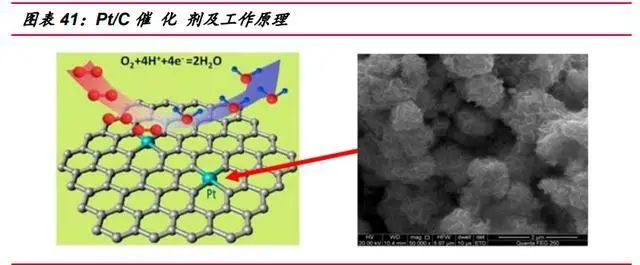 在降低催 化剂成本的方面,目前有两条路径,一条是降低铂的使用量,另一条 则是研发非铂催 化剂,两者都已有所进展。铂使用量的降低现在已有所成效,纵观 燃料电池发展史,每平方厘米需要的铂已经从最初的 50mg 降低到了现在的不足 0.2mg。而非铂催 化剂也在研究中,虽然无铂催 化剂尚未进入工业应用的阶段,但 很可能是未来大幅降低燃料电池成本的关键。 在工业化生产方面,日本、英国、比利时等国外供应商的催 化剂制备技术处于 绝对的领先地位,已经能够实现批量化生产(>10 公斤/批次),而且性能稳定,可 靠性高。国内目前几乎没有产业化催 化剂制造企业, 2)质子交换膜(Proton Exchange Membrane,PEM) 质子交换膜是一种固态电解质膜,其作用是隔离燃料与氧化剂、传递质子(H+)。目前常用的商业化质子交换膜是全氟磺酸膜,其碳氟主链是疏水性的,而侧链部分的 磺酸端基(-SO3H)是亲水性的,膜内会产生微相分离,当膜在润湿状态下,亲水相 相互聚集构成离子簇网络,传导质子。 3)气体扩散层(Gas Diffusion Layer,GDL) 气体扩散层位于流场和催化层之间,其作用是支撑催化层、稳定电极结构,具有 质/热/电的传导功能。因此 GDL 必须具备良好的机械强度、合适的孔结构、良好的 导电性、高稳定性。通常 GDL 由支撑层和微孔层组成,支撑层材料大多是憎水处理 过的多孔碳纸或碳布,微孔层通常是由导电炭黑和憎水剂构成,作用是降低催化层和 支撑层之间的接触电阻,使反应气体和产物水在流场和催化层之间实现均匀再分配, 有利于增强导电性,提高电极性能。 国外大多数制造厂商都已实现气体扩散层的规模化生产,且都有多款适应不同应 用场景的产品销售,包括日本东丽、德国 SGL 和加拿大 AVCarb 等。国内气体扩散 层还处于初级碳微孔层的制备阶段,性能均一性和稳定性尚未得到实际验证。