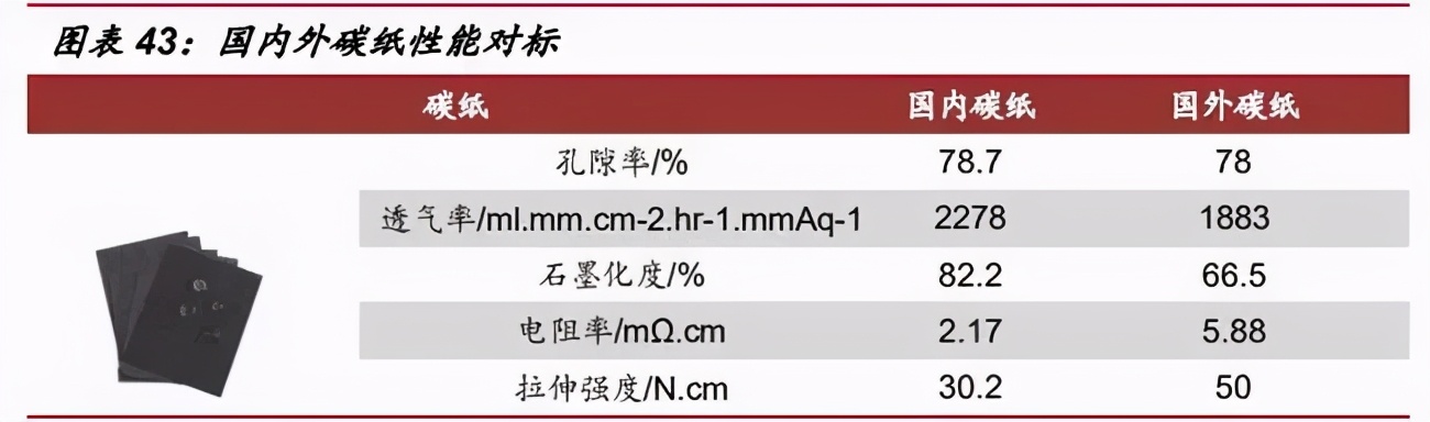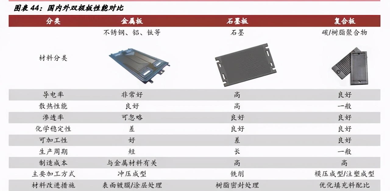 4)双极板(Bipolar Plate,BP) 双极板是燃料电池的阴极板和阳极板,其作用是传导电子、分配反应气并带走生 成水。功能上,双极板材料应是电与热的良导体、具有一 定的强度以及气体致密性 等;稳定性方面要求双极板在燃料电池酸性(pH=2~3)、电位(E=1.1V)、湿热(气 水两相流,约 80℃)环境下具有耐腐蚀性且对燃料电池其他部件不材料的相容无污 染性;商业化方面要求双极板材料要易于加工、成本低。燃料电池常采用的双极板材 料包括石墨碳板、复合双极板、金属双极板三大类,由于车辆空间限制(尤其是乘用 车),要求燃料电池具有较高的功率密度。因此相对较薄的金属双极板有更好的应用 前景。 国内石墨双极板技术近年来发展迅速,技术水平与国外相当,但厚度通常在 2mm 以上。复合膜压碳板在国外已突破 0.8mm 薄板技术,具备与金属板同样的体积功率 密度。目前国内薄碳板开发方面,国鸿有来自于加拿大巴拉德公司的授权技术。纯国 产复合膜压碳板处于研制开发阶段,预计 2021 年 1mm 薄板开始批量生产。