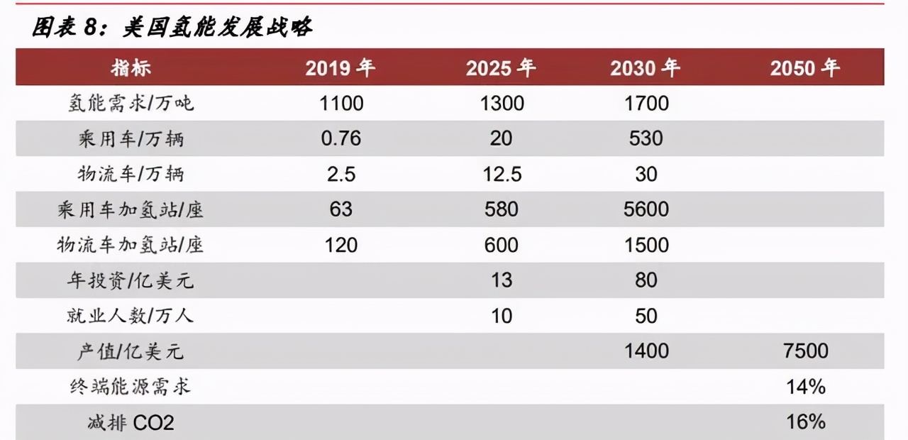 美国重点开展燃料电池研究和布局加氢站建设 2014 年美国颁布的《全面能源战略》确定了氢能在交通转型中的引领作用,并 规划 2030~2040 年将全面实现氢能源经济。美国能源部 2019 年提出了《国家氢能 发展路线图》。目前美国氢能重点发展领域一是开展燃料电池系统研发,各级政府均 提供大量资金资助科研机构进行氢能和燃料电池关键零件研发工作。二是布局建设加 氢站,如美国加州每年计划拨款 2000 万美元用于加氢站建设,直到加州至少有 100 座加氢站;到 2025 年建立 200 座加氢站。截至 2018 年底,美国建有加氢站 42 座, 氢燃料车 5899 辆。