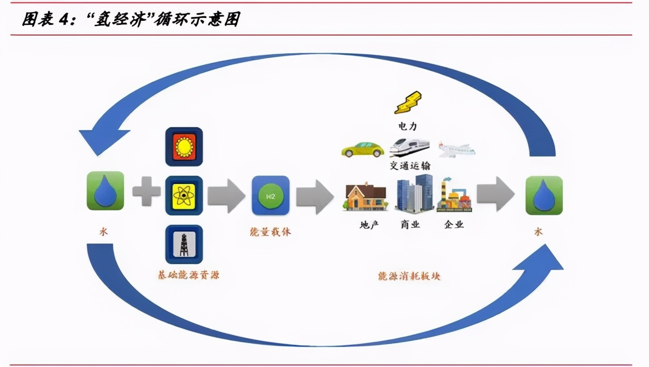 氢能源生产和使用形成可循环闭环,实现可持续发展 1970 年通用汽车首次提出“氢经济”的概念。近年来,随着燃料电池的迅速发展, 氢能作为最适宜的燃料也随之进入一个高速发展阶段。氢能来自于水用,使用后的产 物仍为水,由此形成一个可循环闭环系统,具有可持续性。