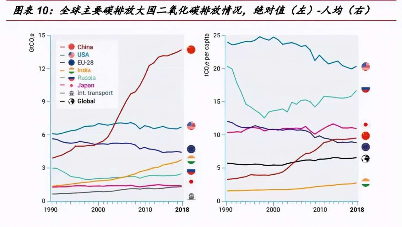 德国重视氢能交通工具的开发和氢能与可再生能源的协同发展 德国是欧洲氢能发展较快的国家,已在通信基站、加氢站、燃料电池车、氢能列 车、氢源建设等方面有所应用。德国联邦交通和数字基础设施部等正在编制《国家氢 能发展战略》,目标是将氢能与大力发展可再生能源战略相结合,大力推进低碳转型 发展。其重点发展领域一是开发零排放氢能交通工具,如清洁巴士、氢能列车等(德 国铁路电气化程度较低,约 59%的火车未实现电气化,德国政府试图使用燃料电池 火车来解决环境和电气化程度低的问题);二是投资可再生能源绿色制氢工艺及设施 建设。2019 年上半年部分德国企业在德国发起了 GET H2 倡议,目标是利用氢能促 进能源转型。合作企业计划在德国埃姆斯兰地区建立氢能基础设施,将该地区的能源、 工业、运输和供热部门联系起来,建造 105 兆瓦的电制氢(Power to Gas)设施, 利用风能生产“绿色氢气”,并利用现有基础设施运输、储存及应用氢气。截至 2018 年底,德国建有加氢站 60 座,氢燃料车 500 辆。 韩国氢能发展目标是氢能产业与传统制造业结合促进经济增长 韩国政府发展氢能的目标是通过发展氢经济减少对石油进口的依赖,同时将氢技 术与汽车、航运和石油化工等传统制造业联系起来,为钢铁生产、石油化工和机械工 程等传统行业带来新的投资和就业机会,形成新的经济增长点。韩国政府 2019 年初 发布《氢能发展路线图 2040》,计划到 2040 年,氢气供应量达到 526 万吨,累计生 产氢燃料电池汽车 620 万辆(含出口 330 万辆),建设 1200 座。截至 2018 年底, 韩国建有加氢站 14 座,氢燃料车 300 辆。 2.3 中国减排任务艰巨,发展清洁能源迫在眉睫 中国承诺到 2060 年实现“碳中和”,减排任务艰巨 我国减排任务艰巨,年排放量位居世界第一。根据联合国数据,2018 年中国碳 排放达到 137 亿吨,同比增长 1.6%。尽管我国碳排放的增速已经放缓,但从总量看, 占全球总排放量的 1/4 以上,仍是全球排名第一的碳排放国。作为世界工厂,在产业 链日趋完善、国产制造加工能力与日俱增的同时,我国的碳排放量也快速攀升。作为 负责任的大国,走低碳节能发展之路既是我国的责任所系,亦是使命所向。