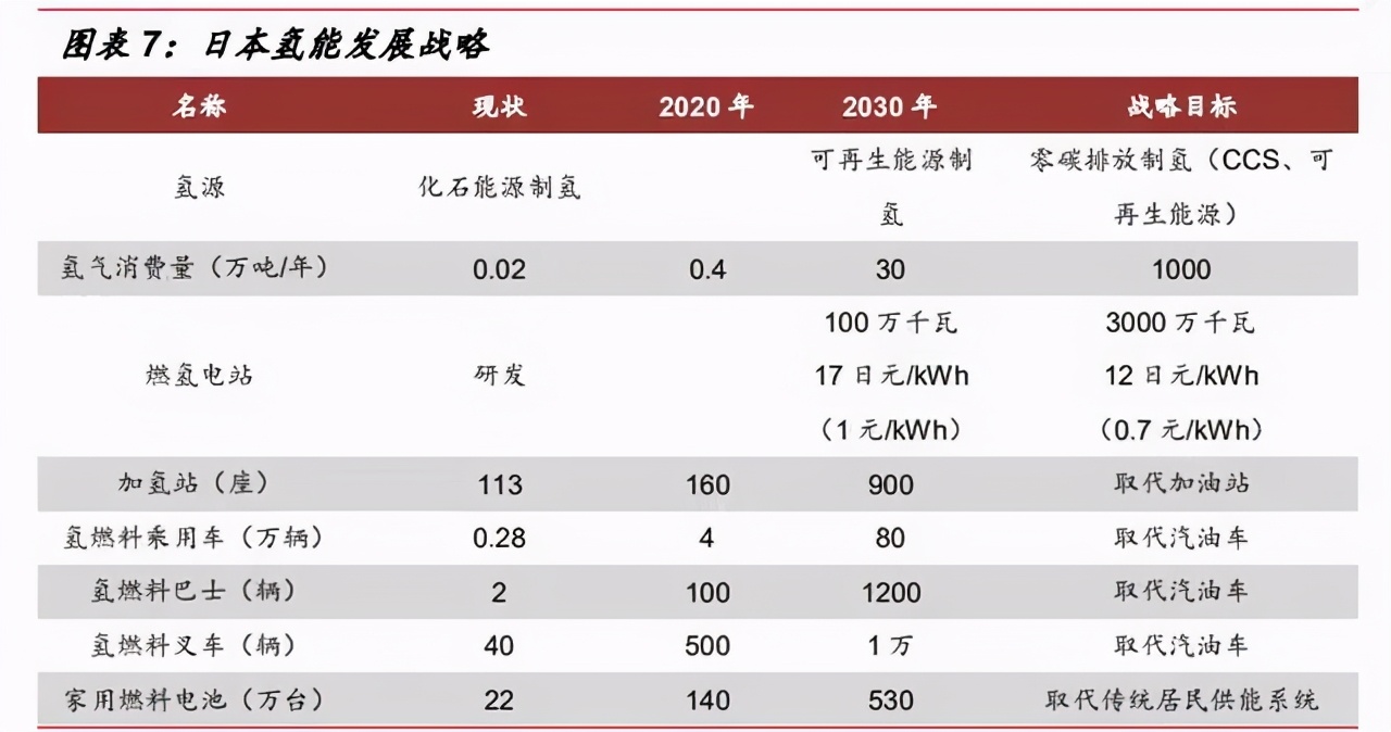 氢虽然主要用作化工基础原料,但在能源转型过程中,其更重要的是作为一种清 洁能源和良好的能源载体,具有清洁高效、可储能、可运输、应用场景丰富等特点。氢能能够帮助工业、建筑、交通等主要终端应用领域实现低碳化,包括作为燃料电池 汽车应用于交通运输领域,作为储能介质支持大规模可再生能源的整合和发电,应用 于分布式发电或热电联产为建筑提供电和热,为工业领域直接提供清洁的能源等。 目前全球用氢量约 1.15 亿吨,其中约 61%用于炼油和生产化肥等,39%用于生 产甲醇和其他化学品以及燃料等。预计 2050 年氢能将承担全球 18%的能源需求,氢 能产业将创造 3000 万个工作岗位,减少 60 亿吨 CO2排放,创造 2.5 万亿美元的市 场价值。日本、美国、欧洲等主要工业国家均将氢能列入国家能源发展战略,氢能产 业的发展已初具规模,但发展重点有所不同。 日本政府大力推进氢能全产业链发展,致力实现“氢能社会” 为解决过度依赖进口化石能源、核电重启困难以及国内可再生能源禀赋一般等问 题,日本政府高度重视氢能产业的发展。日本经济产业省(METI)2019 年提出了《氢 能与燃料电池战略路线图》,其目标是:第一阶段创造需求,到 2025 年加速推广和 普及氢能交通、民用市场;第二阶段解决供应问题,到 2030 年实现氢燃料发电和通 过扩大氢能进口解决大规模供给;到 2040 年,建立起零碳排放的供氢体系,使氢加 入传统的“电、热”系统构建全新的二次能源结构。截至 2018 年底,日本建有加氢站 113 座,氢燃料车 2839 辆,家用氢燃料电池 22 万台。