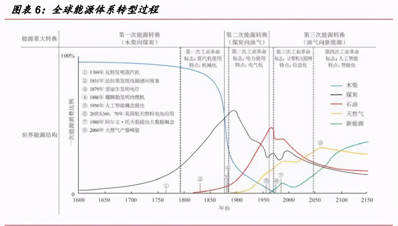 2.2 能源短缺和环境恶化,加速推动全球氢能开发 脱碳加氢和清洁高效是百年来能源科技进步的趋势 纵观能源的发展历史,从最初使用固态的木柴、煤炭,到液态的石油,直至气态 的天然气,不难看出其 H/C 比提高的趋势和固-液-气形式的渐变过程。木柴的氢碳比 在 1:3~10 之间,