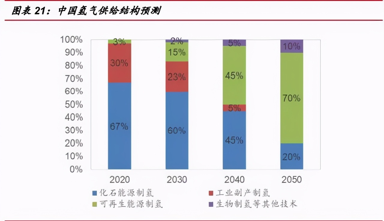 中国氢能应用市场潜力巨大。氢能在能源、交通、工业、建筑等领域具有广阔的 应用前景,尤其以燃料电池车为代表的交通领域是氢能初期应用的突破口与主要市场。中国汽车销量已连续十年居全球第一,其中新能源汽车销量占全球总销量的 50%。工信部在新发布的《新能源汽车产业发展规划 2021-2035 年》中,将以新能源汽车 高质量发展为主线,探索新能源汽车与能源、交通、信息通信等深度融合发展的新模 式,重点向燃料电池车拓展。在工业领域,中国航贴、水泥、化工等产品产量连续多 年居世界首位,氢气可为其提供高品质的燃料和原料。在建筑领域,氢气通过发电、 直接燃烧、热电联产等形式为居民住宅或商业区提供电热水冷多联供。未来,随着碳 减排压力的增大与氢气规模化应用成本的降低,氢能有望在建筑、工业能源领域取得 突破性进展。 中国氢能与燃料电池技术基本具备产业化基础。经过多年科技攻关,中国已掌握 了部分氢能基础设施与一批燃料电池相关核心技术,制定出台了国家标准 86 项次, 具备一 定的产业装备与燃料电池整车的生产能力;中国燃料电池车经过多年研发积 累,已形成自主特色的电-电混合技术路线,并经历规模示范运行。 根据中国氢能联盟的预计,到 2030 年,中国氢气需求量将达到 3500 万吨,在 终端能源体系中占比 5%。到 2050 年氢能将在中国终端能源体系中占比至少达到 10%,氢气需求量接近 6000 万吨,可减排约 7 亿吨二氧化碳,产业链年产值约 12 万亿元。 3、产业发展基础先行,国产化同步推进 2019 年氢能源首次写入《政府工作报告》,政府工作任务中明确“将推动充电、 加氢等设施建设”。自 2011 年以来有关部门已经从战略、产业结构、科技、财政等方 面相继发布了一系列政策,引导鼓励氢燃料电池等氢能产业发展。按照 2019 年发布 的《中国氢能源及燃料电池产业白皮书》,国内氢能从制氢到用氢发展路径逐渐清晰, 有助于我国提早进入能源自给自足的氢能社会: 制氢产业:短期优先选用工业副产氢,中期采用化石能源制氢结合碳捕捉技术, 长期采用可再生能源电解水制氢; 氢能储运:将按照“低压到高压”“气态到多相态”的技术发展方向,逐步提升氢气 的储存和运输能力; 燃料电池系统:将持续围绕功率、性能、寿命、成本四大要素而发展。具体应用 集中在交通领域,从商用车切入、乘用车跟进。