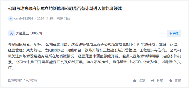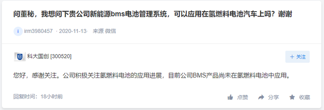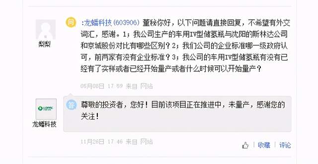 「氢问董秘」是氢云链旗下的全新栏目,主要包含投资者在互动平台上针对氢能、燃料电池等内容方面进行提问和相关企业的回复,每天一期。在这里,你可以全面了解企业的氢能发展动态。 龙蟠科技问: 董秘你好,以下问题请直接回复,不希望有外交词汇,感谢。1;我公司生产的车用IV型储氢瓶与沈阳的斯林达公司和京城股份对比有哪些区别?2;我们公司的企业标准哪一级政府认可,前两家有没有企业标准?3;我公司的车用IV型储氢瓶有没有已经有了实样或者已经开始量产或者什么时候可以开始量产? 龙蟠科技答: 尊敬的投资者,您好!目前该项目正在推进中,未量产,感谢您的关注! 科大国创问: 问董秘,我想问下贵公司新能源bms电池管理系统,可以应用在氢燃料电池汽车上吗?谢谢 科大国创答: 您好,感谢关注。公司积极关注氢燃料电池的应用进展,目前公司BMS产品尚未在氢燃料电池中应用。 天能重工问: 公司与地方政府新成立的新能源公司是否有计划进入氢能源领域 天能重工答: 尊敬的投资者,您好。 公司在武川县、达茂旗等地成立的子公司经营范围如下:新能源开发、建设、运维、经营管理;风力发电、太阳能发电;储能项目、氢能开发及工程建设与运营管理;工程建造与咨询。 公司积极关注新能源发展趋势及所在地资源情况,经营范围中涵盖氢能开发。但进入氢能源领域需要一定的条件积累。公司未来是否开展氢能源开发及何时开展,存在不确定性。具体请您以公司的公告为准。 感谢您的关注。 编辑:氢氢我心 校对:风 免责声明:本文观点不构成投资建议,请谨慎对待 |