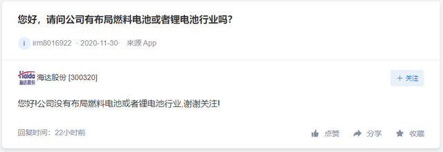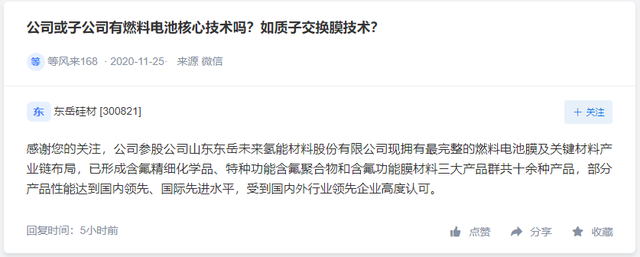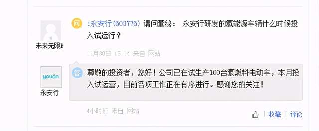 「氢问董秘」是氢云链旗下的全新栏目,主要包含投资者在互动平台上针对氢能、燃料电池等内容方面进行提问和相关企业的回复,每天一期。在这里,你可以全面了解企业的氢能发展动态。 永安行问: 请问董秘: 永安行研发的氢能源车辆什么时候投入试运行? 永安行答: 尊敬的投资者,您好!公司已在试生产100台氢燃料电动车,本月投入试运营,目前各项工作正在有序进行。感谢您的关注! 海达股份问: 您好,请问公司有布局燃料电池或者锂电池行业吗? 海达股份答: 您好!公司没有布局燃料电池或者锂电池行业,谢谢关注! 东岳硅材问: 公司或子公司有燃料电池核心技术吗?如质子交换膜技术? 东岳硅材答: 感谢您的关注,公司参股公司山东东岳未来氢能材料股份有限公司现拥有最完整的燃料电池膜及关键材料产业链布局,已形成含氟精细化学品、特种功能含氟聚合物和含氟功能膜材料三大产品群共十余种产品,部分产品性能达到国内领先、国际先进水平,受到国内外行业领先企业高度认可。 编辑:氢氢我心 校对:风 免责声明:本文观点不构成投资建议,请谨慎对待 |