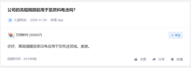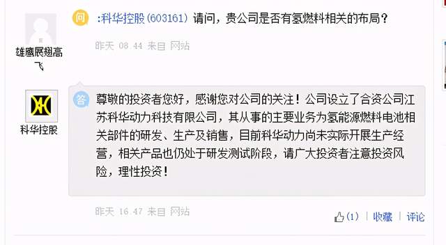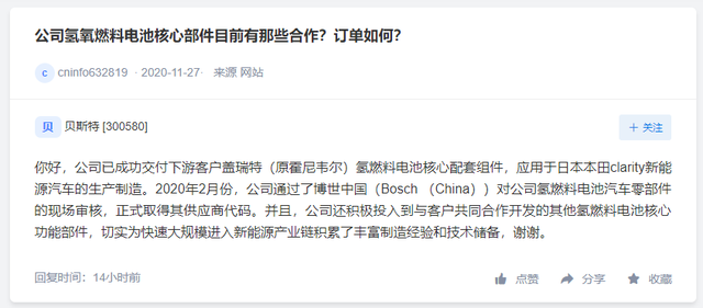 「氢问董秘」是氢云链旗下的全新栏目,主要包含投资者在互动平台上针对氢能、燃料电池等内容方面进行提问和相关企业的回复,每天一期。在这里,你可以全面了解企业的氢能发展动态。 科华控股问: 请问,贵公司是否有氢燃料相关的布局? 科华控股答: 尊敬的投资者您好,感谢您对公司的关注!公司设立了合资公司江苏科华动力科技有限公司,其从事的主要业务为氢能源燃料电池相关部件的研发、生产及销售,目前科华动力尚未实际开展生产经营,相关产品也仍处于研发测试阶段,请广大投资者注意投资风险,理性投资! 万顺新材问: 公司的高阻隔膜能用于氢燃料电池吗? 万顺新材答: 你好,高阻隔膜目前没有应用于您所述领域。谢谢。 贝斯特问: 公司氢氧燃料电池核心部件目前有 贝斯特答: 你好,公司已成功交付下游客户盖瑞特(原霍尼韦尔)氢燃料电池核心配套组件,应用于日本本田clarity新能源汽车的生产制造。2020年2月份,公司通过了博世中国(Bosch (China))对公司氢燃料电池汽车零部件的现场审核,正式取得其供应商代码。并且,公司还积极投入到与客户共同合作开发的其他氢燃料电池核心功能部件,切实为快速大规模进入新能源产业链积累了丰富制造经验和技术储备,谢谢。 编辑:氢氢我心 校对:风 免责声明:本文观点不构成投资建议,请谨慎对待 |